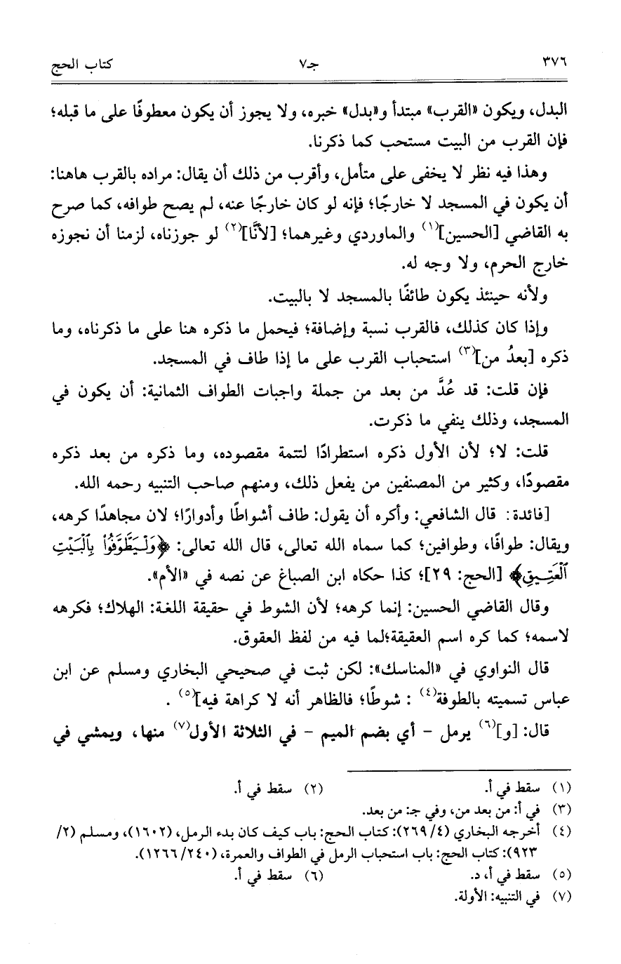 وهذا فيه نظر لا يخفى على متأمل، وأقرب من ذلك أن يقال: مراده بالقرب هاهنا: أن يكون في المسجد لا خارجاً؛ فإنه لوكان خارجاً عنه، لم يصح طوافه، كما صرح به القاضي [الحسين] والماوردي وغيرهما؛ [لأنَّا] لو جوزناه، لزمنا أن نجوزه خارج الحرم، ولا وجه له.