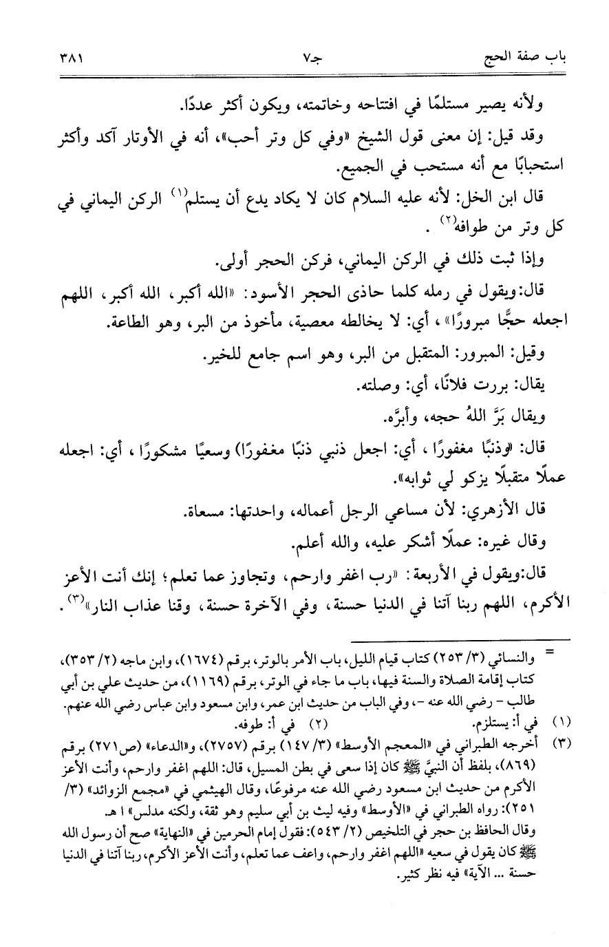 قال: ويقول في رمله كلما حاذى الحجر الأسود: "الله أكبر، الله أكبر، اللهم اجعله حجًّا مبرورًا"، أي: لا يخالطه معصية، مأخوذ من البر، وهو الطاعة.