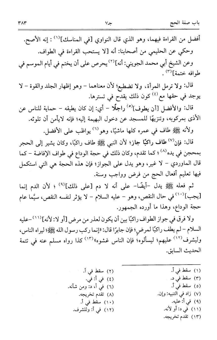 ولا فرق في جواز الطواف راكباً بين أن يكون لعذر من مرض [أو لا: لأنه]، -عليه السلام - لم يطف راكباً لمرض؛ فإن جابراً قال: ربما ركب رسول الله صلى الله عليه وسلم؛ ليراه الناس، وليشرف عليهم؛ ليسألوه؛ فإن الناس غشوه" كذا رواه مسلم عنه في تتمة الحديث السابق.