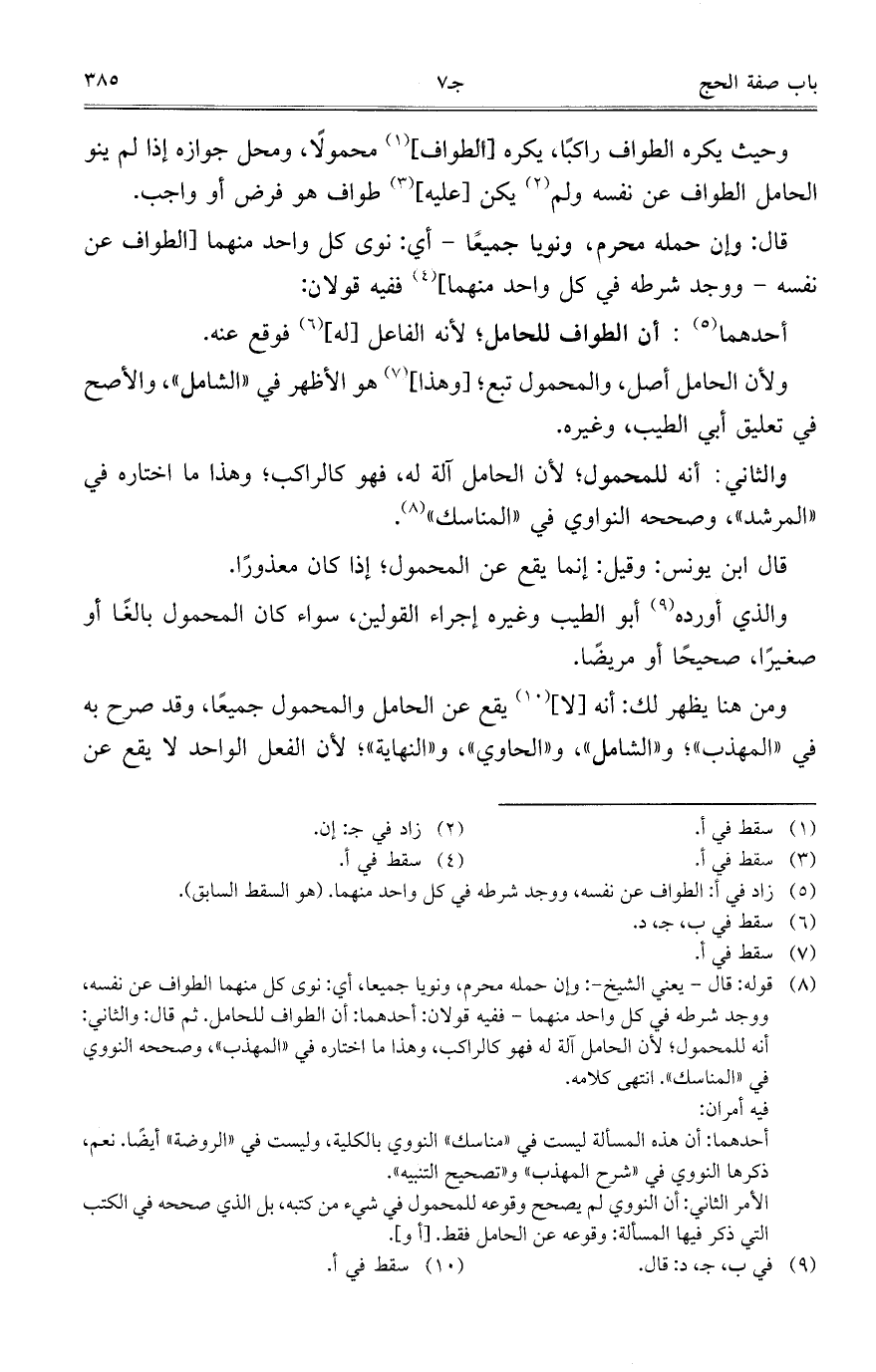 قال: وإن حمله محرم، ونوبا جميعاً - أي: نوى كل واحد منهما [الطواف عن نفسه - ووجد شرطه في كل واحد منهما] ففيه قولان: