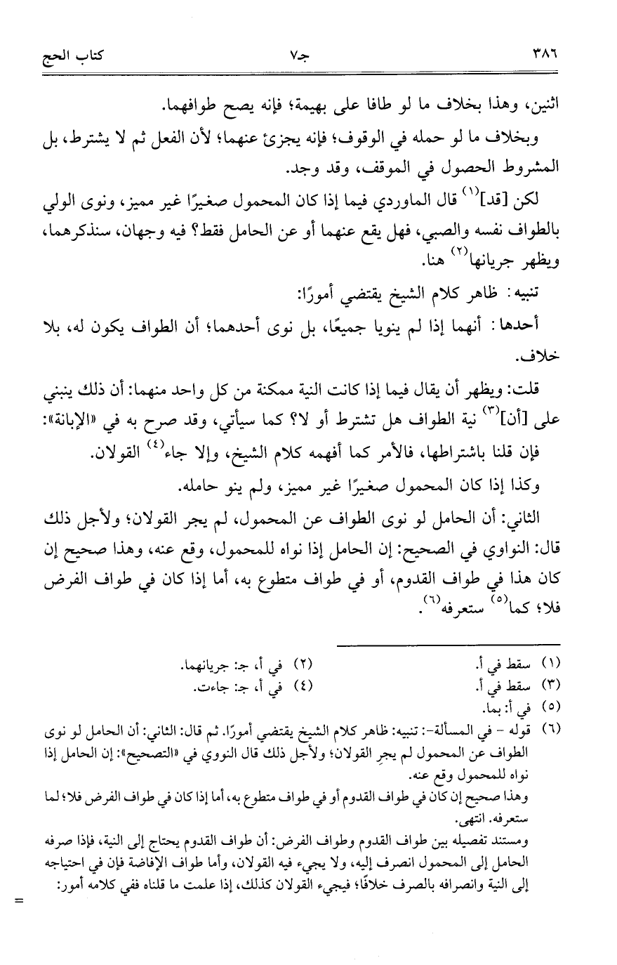 الثاني: أن الحامل لو نوى الطواف عن المحمول، لم يجر القولان؛ ولأجل ذلك قال: النواوي في الصحيح؛ إن الحامل إذا نواه للمحمول، وقع عنه، وهذا صحيح إن كان هذا في طواف القدوم، أو في طواف متطوع به، أما إذا كان في طواف الفرض فلا؛ كما ستعرفه.