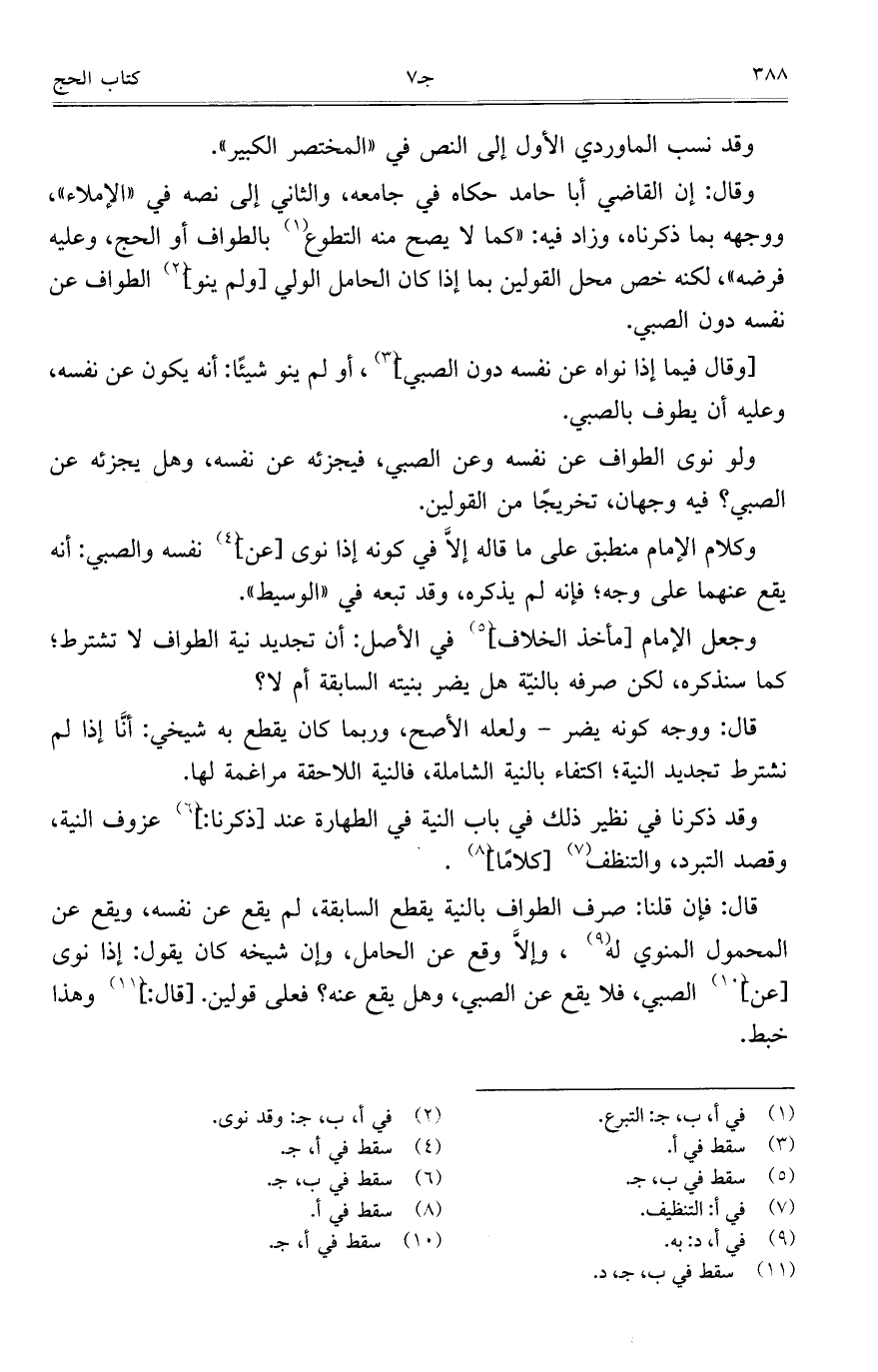 قال: فإن قلنا: صرف الطواف بالنية يقطع السابقة، لم يقع عن نفسه، ويقع عن المحمول المنوي له، وإلاَّ وقع عن الحامل، وإن شيخه كان يقول: إذا نوى [عن] الصبي، فلا يقع عن الصبي، وهل يقع عنه؟ فعلى قولين. [قال:] وهذا خبط.