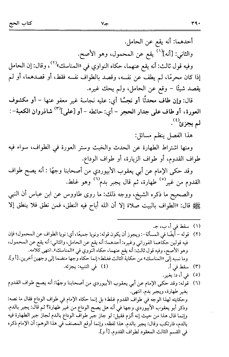 قال: وإن طاف محدثاً أو نجساً أى: عليه نجاسة غير معفو عنها - أو مكشوف العورة، أو طاف على جدار الحجر- أى: حائطه – أو [على] شاذروان الكعبة-: لم يجزئ.