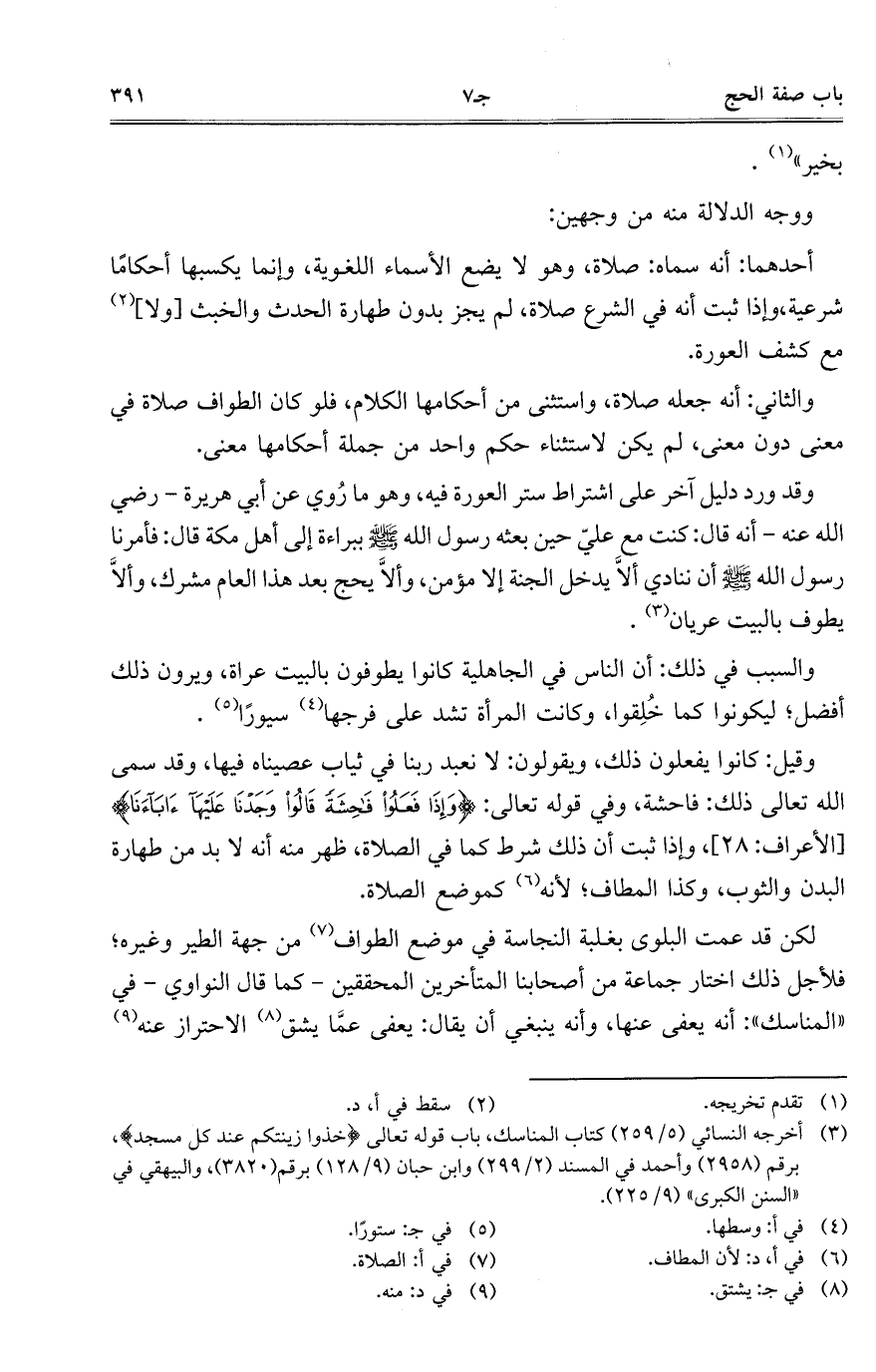 والثاني: أنه جعله صلاة، واستثنى من أحكامها الكلام، فلو كان الطواف صلاة في معنى دون معنى، لم يكن لاستثناء حكم واحد من جملة أحكامها معنى.