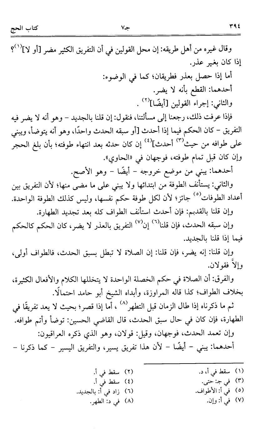 والثاني: يستأنف الطوفة من ابتدائها ولا يبني على ما مضى منها؛ لأن التفريق بين أعداد الطوفات جائز؛ لأن لكل طوفة حكم نفسها، وليس كذلك الطوفة الواحدة.