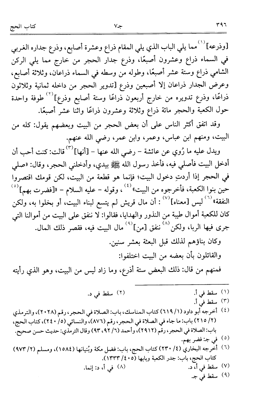 ويدل عليه ما رُوي عن عائشة – رضي الله عنها – [أنها] قالت: كنت أحب أن أدخل البيت فأصلي فيه، فأخذ رسول لاله صلى الله عليه وسلم بيدي، وأدخلني الحجر، وقال: "صلى في الحجر إذا أردتِ دخول البيت؛ فإنما هو قطعة من البيت، لكن قومك اقتصروا حين بنوا الكعبة، فأخرجوه من البيت"، وقوله- عليه السلام- " [فضرت بهم] النفقة" ليس [معناه]: أن مال قريش لم يتسع لبناء البيت، أو بخلوا به، ولكن كان للكعبة أموال طيبة من النذور والهدايا، فقالوا: لا ننفق على البيت من أموالنا التي جرى فيها الربا، ولكن ننفق [من] مال البيت فيه، فقصر ذلك المال.