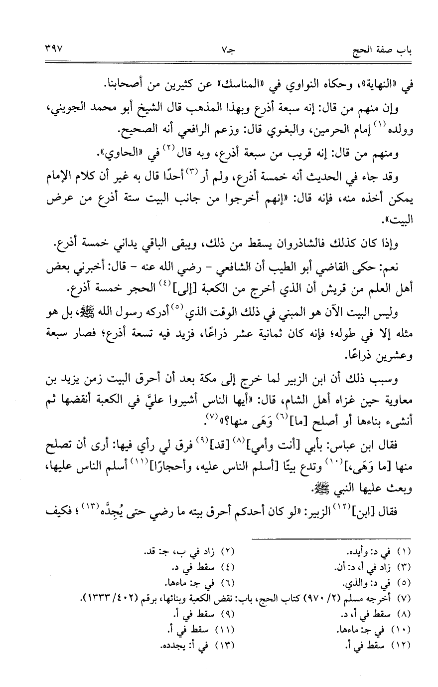 وإن منهم من قال: إنه سبعة أذرع وبهذا المذهب قال الشيخ أبو محمد الجويني، وولده إمام الحرمين، والبغوي قال: وزعم الرافعي أنه الصحيح.
