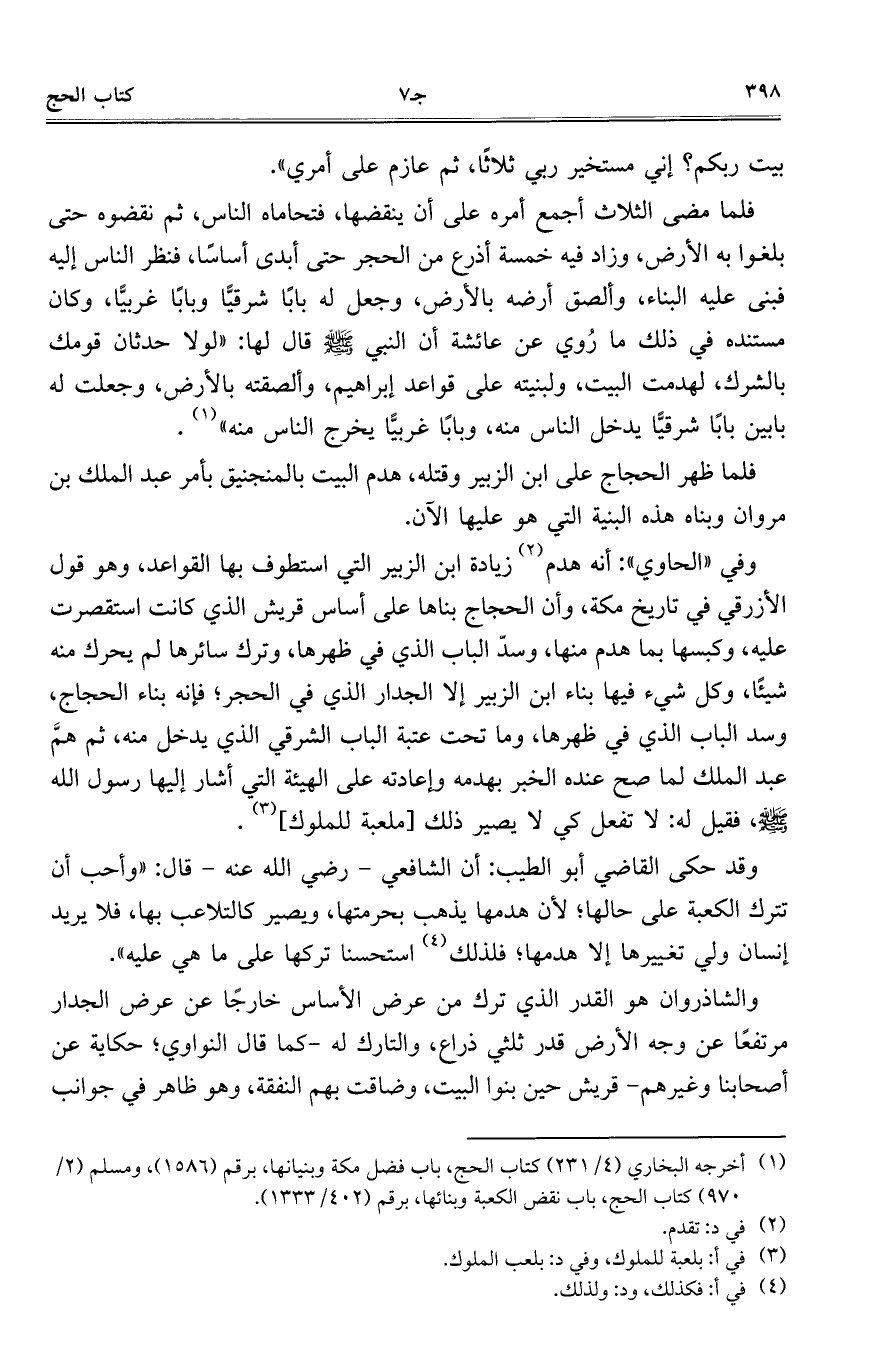 وفي "الحاوي": أنه هدم زيادة ابن الزبير التي استطوف يها القواعد، وهو قول الأزرقي في تاريخ مكة، وأن الحجاج بناها على أساس قريش الذي كانت استقصرت عليه، وكبسها بما هدم منها، وسدّ الباب الذي في ظهرها، وترك سائرها لم يحرك منه شيئاً، وكل شيء فيها بناء ابن الزبير إلا الجدار الذي في الحجر؛ فإنه بناء الحجاج، وسد الباب الذي في ظهرها، وما تحت عتبة الباب الشرقي الذي يدخل منه، ثم همَّ عبد الملك لما صح عنده الخبر بهدمه وإعادته على الهيئة التي أشار إليها رسول الله صلى الله عليه وسلم، فقل له: لا تفعل كي لا يصير ذلك [ملعبة للملوك].