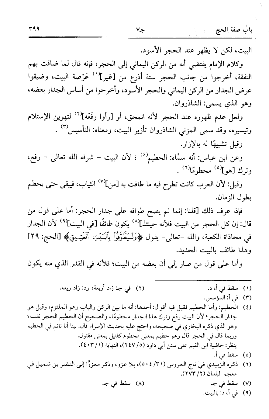 فإذا عرف ذلك [قلنا: إنما لم يصح طوافه على جدار الحجر: أما على قول من قال: إن كل الحجر من البيت فلأنه حينئذ] يكون طائفاً [في البيت] لأن الجدار في محاذاة الكعبة، والله –تعالى- يقول {وَلْيَطَّوَّفُوا بِالْبَيْتِ الْعَتِيقِ} [الحج: 29] وهذا طائف بالبيت الجديد.