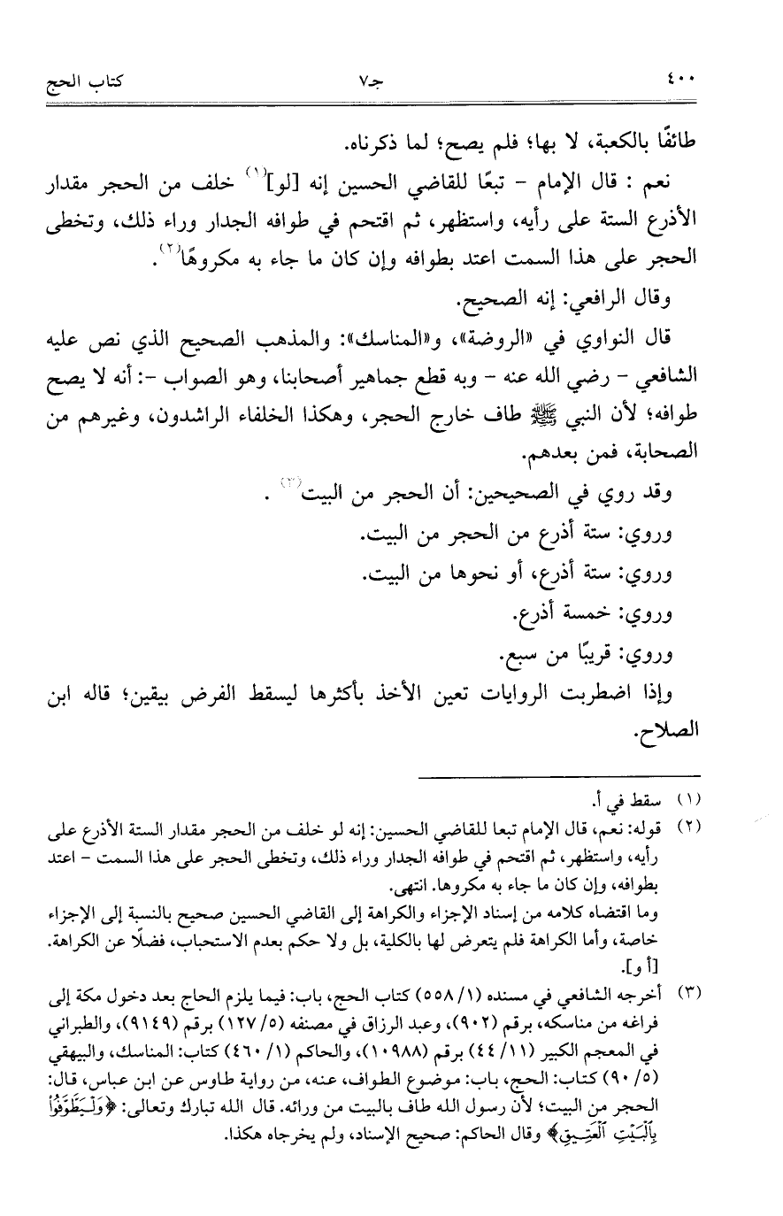 قال النواوي في "الروضة"، و"المناسك": والمذهب الصحيح الذي نص عليه الشافعي - رضي الله عنه - وبه قطع جماهير أصحابنا، وهو الصواب -: أنه لا يصح طوافه؛ لأن النبي طاف خارج الحجر، وهكذا الخلفاء الراقدون، وغيرهم من الصحابة، فمن بعدهم.