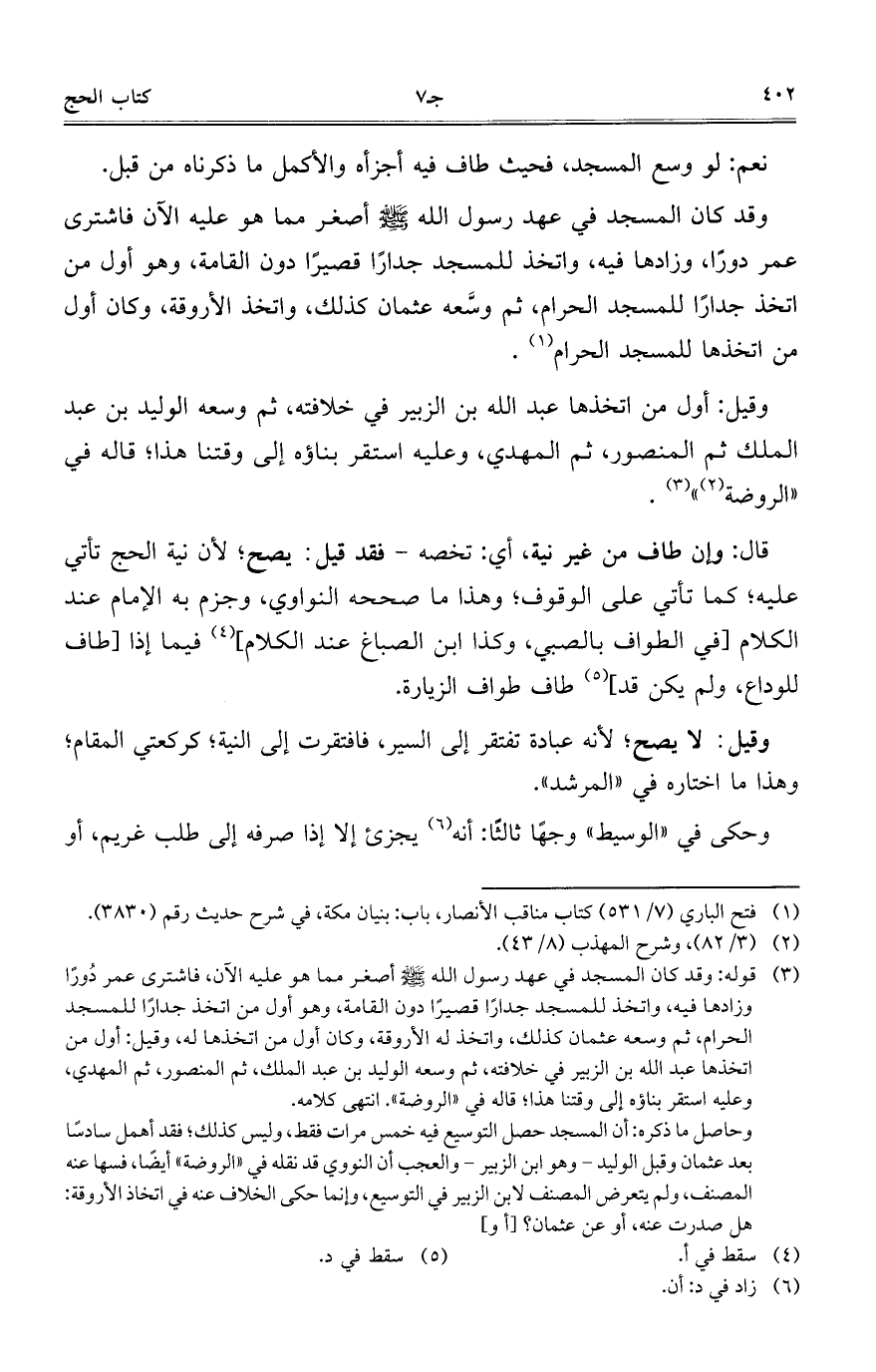 وقيل: أول من اتخذها عبد الله بن الزبير في خلافته، ثم وسعه الوليد بن عبد الملك ثم المنصور، ثم المهدي، وعليه استقر بناؤه إلى وقتنا هذا؛ قاله في "الروضة".