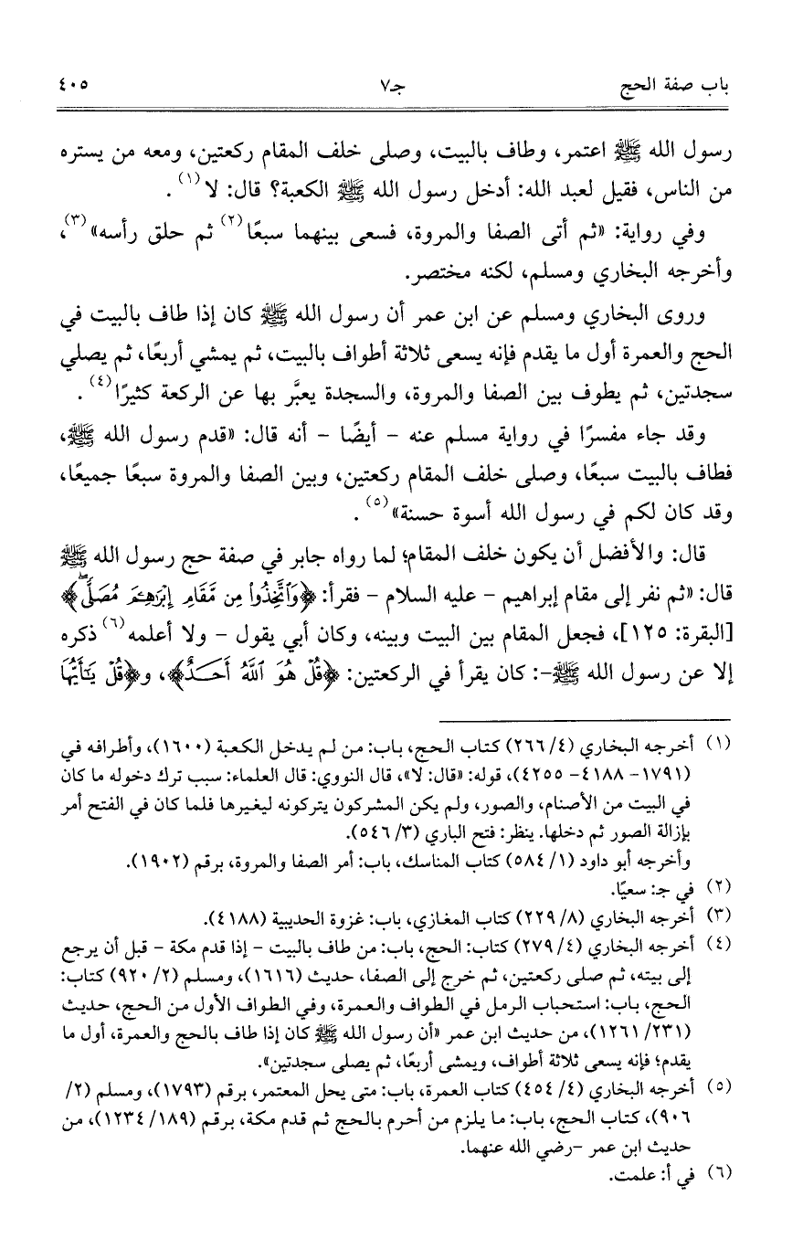 وقد جاء مفسراً في رواية مسلم عنه – أيضاً- أنه قال: "قدم رسول الله صلى الله عليه وسلم، فطاف بالبيت سبعاً، وصلى خلف المقام ركعتين، وبين الصفا والمروة سبعاً جميعاً، وقد كان لكم في رسول الله أسوة حسنة".