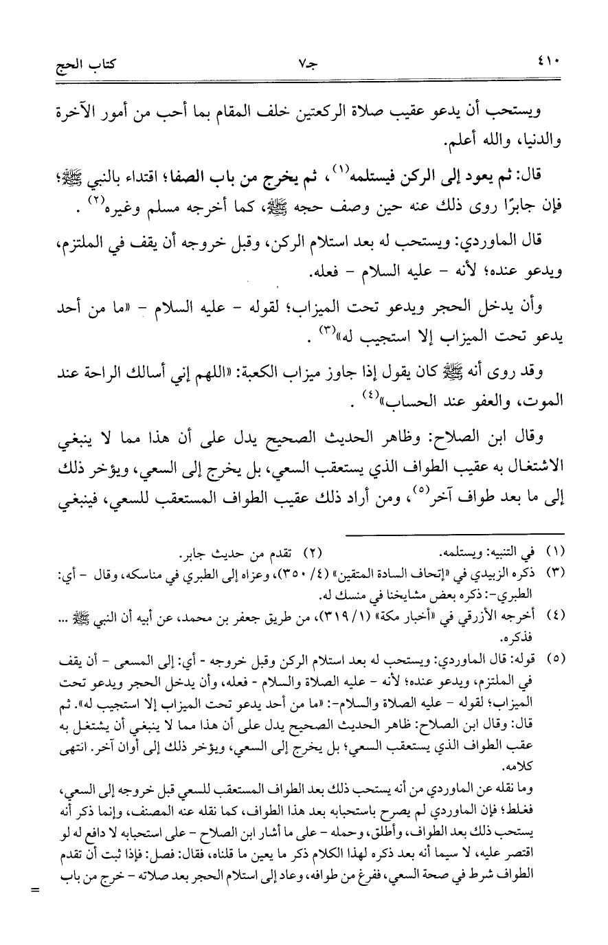 قال: ثم بعود إلى الركن فيستلمه، ثم يخرج من باب الصفا؛ اقتداء بالنبي صلى الله عليه وسلم؛ فإن جابراً روى ذلك عنه حين وصف حجه صلى الله عليه وسلم، كما أخرجه مسلم وغيره.