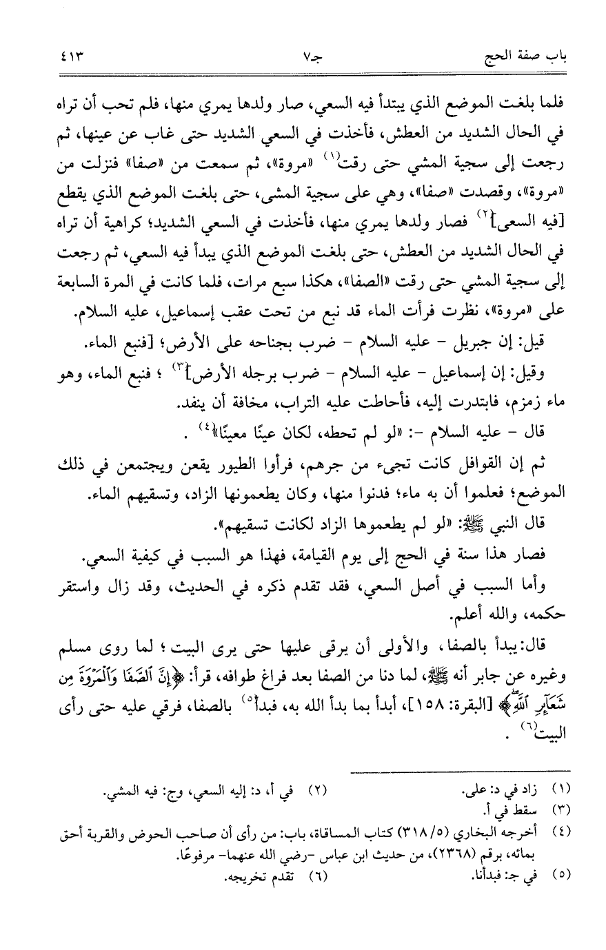 فلما بلغت الموضع الذي يبدأ فيه السعي، صار ولدها يمري منها، فلم تحب أن تراه في الحال الشديد من العطش، فأخذت في السعي الشديد حتى غاب عن عينها، ثم رجعت إلى سجية المشي حتى رقت "مروة"، ثم سمعت من "صفا" فنزلت من "مروة" وقصدت "صفا"، وهي على سجية المشى، حتى بلغت الموضع الذي يقطع [فيه السعى] فصار ولدها يمري منها، فأخذت في السعي الشديد؛ كراهية أن تراه في الحال الشديد من العطش، حتى بلغت الموضع الذي يبدأ فيه السعي، ثم رجعت إلى سجية المشي حتى رقت "الصفا"، هكذا سبع مرات، فلما كانت في المرة السابعة على "مروة" نظرت فرأت الماء قد نبع من تحت عقب إسماعيل، عليه السلام.