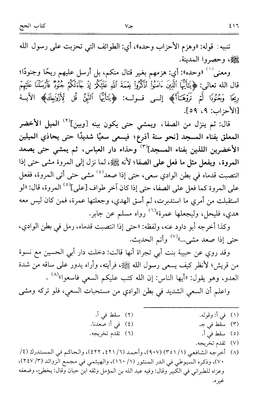 وقد روي عن حبيبة بنت أبي تجراة أنها قالت: دخلت دار أبي الحسين مع نسوة من قريش؛ لأنظر كيف يسعى رسول الله صلى الله عليه وسلم، فرأيته، وأراه يدور على ساقه من شدة العدو، وهو يقول: "رأيها الناس: إن الله كتب عليكم السعي فاسعوا".