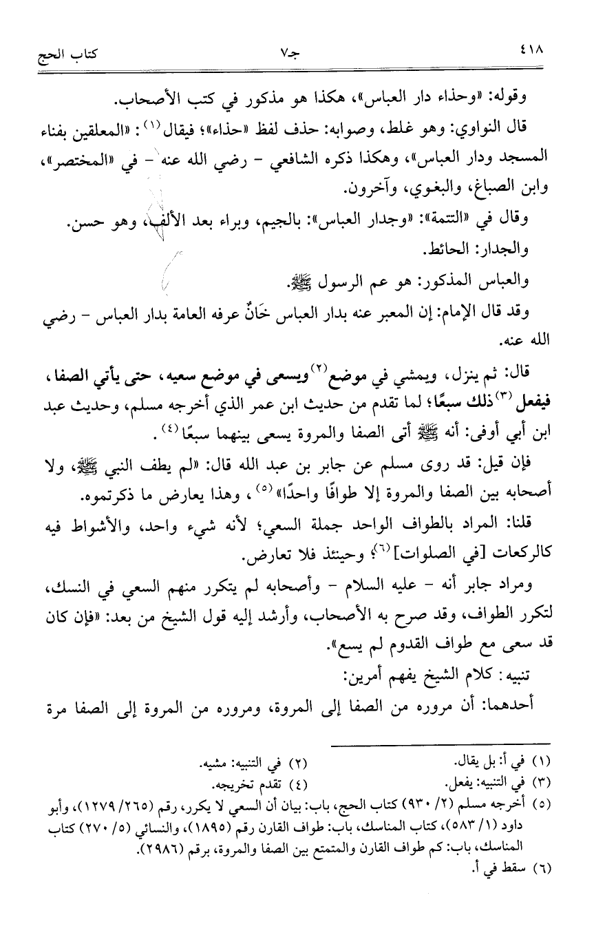 قال النواوي: وهو غلط، وصوابه: حذف لفظ "حذاء"؛ فيقال: "المعلقين بفناء المسجد ودار العباس"، وهكذا ذكره الشافعي - رضي الله عنه - في "المختصر"، وابن الصباغ، والبغوي، وآخرون.