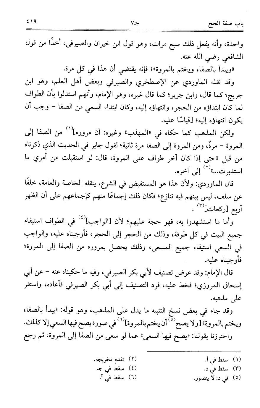 وقد نقله الماوردي عن الإصطخري والصيرفي وبعض أهل العلم، وهو ابن جريج؛ كما قال، وابن جرير؛ كما قال غيره، وهو الإمام، وأنهم استدلوا بأن الطواف لما كان ابتداؤه من الحجر، وانتهاؤه إليه، وكان ابتداء السعي من الصفا - وجب أن يكون انتهاؤه إليه؛ [قياساً عليه.