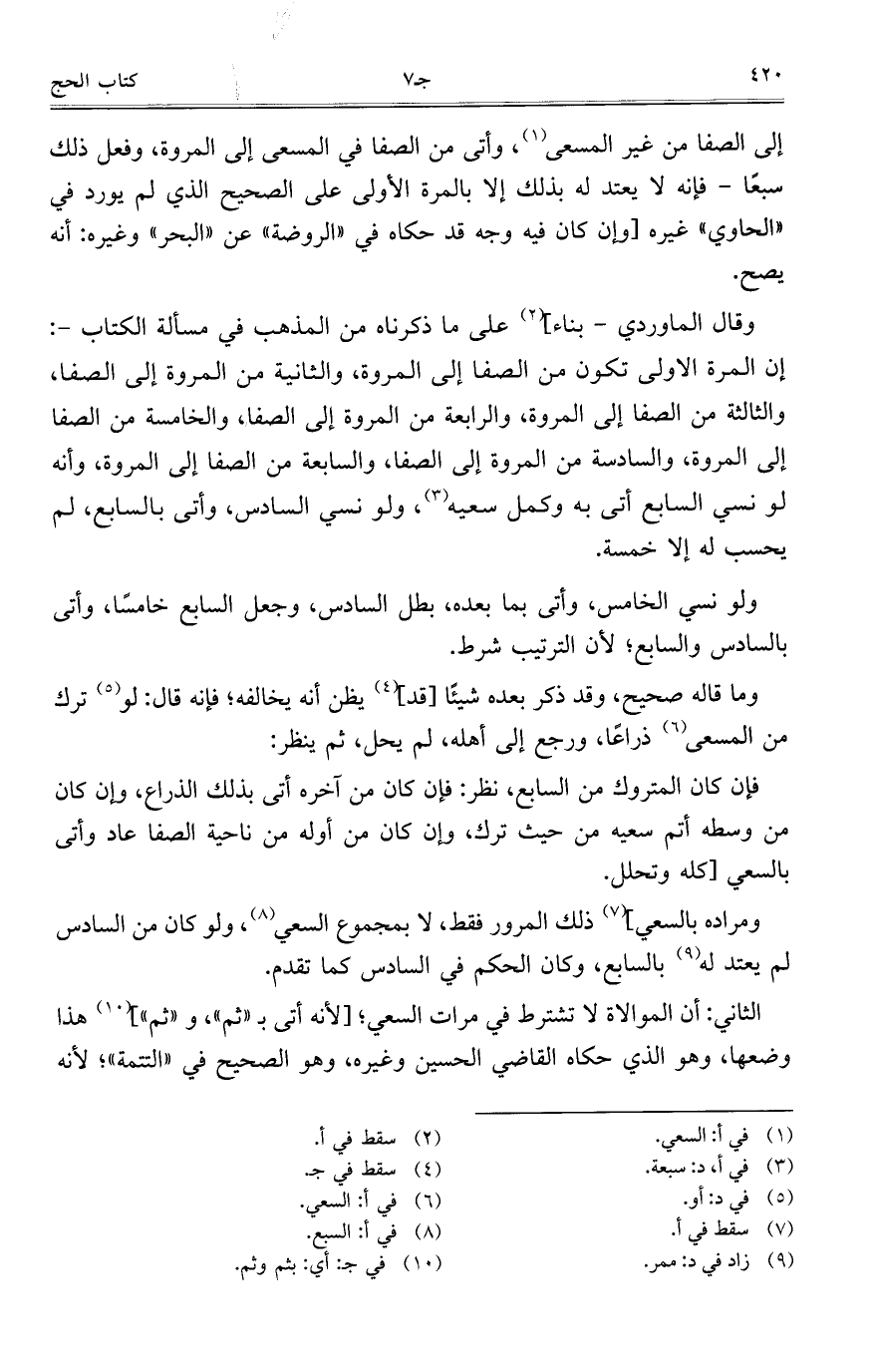 وقال الماوردي- بناء]، على ما ذكرناه من المذهب في مسألة الكتاب-: إن المرة الأولى تكون من الصفا إلى المروة، والثانية من المروة إلى الصفا، والثالثة من الصفا إلى المروة، والرابعة من المروة إلى الصفا، والخامسة من الصفا إلى المروة، والسادسة من المروة إلى الصفا، والسابعة من الصفا إلى المروة، وأنه لو نسي السابع أتى به وكمل سعيه، ولو نسي السادس، وأتى السابع، لم يحسب له إلا خمسة.