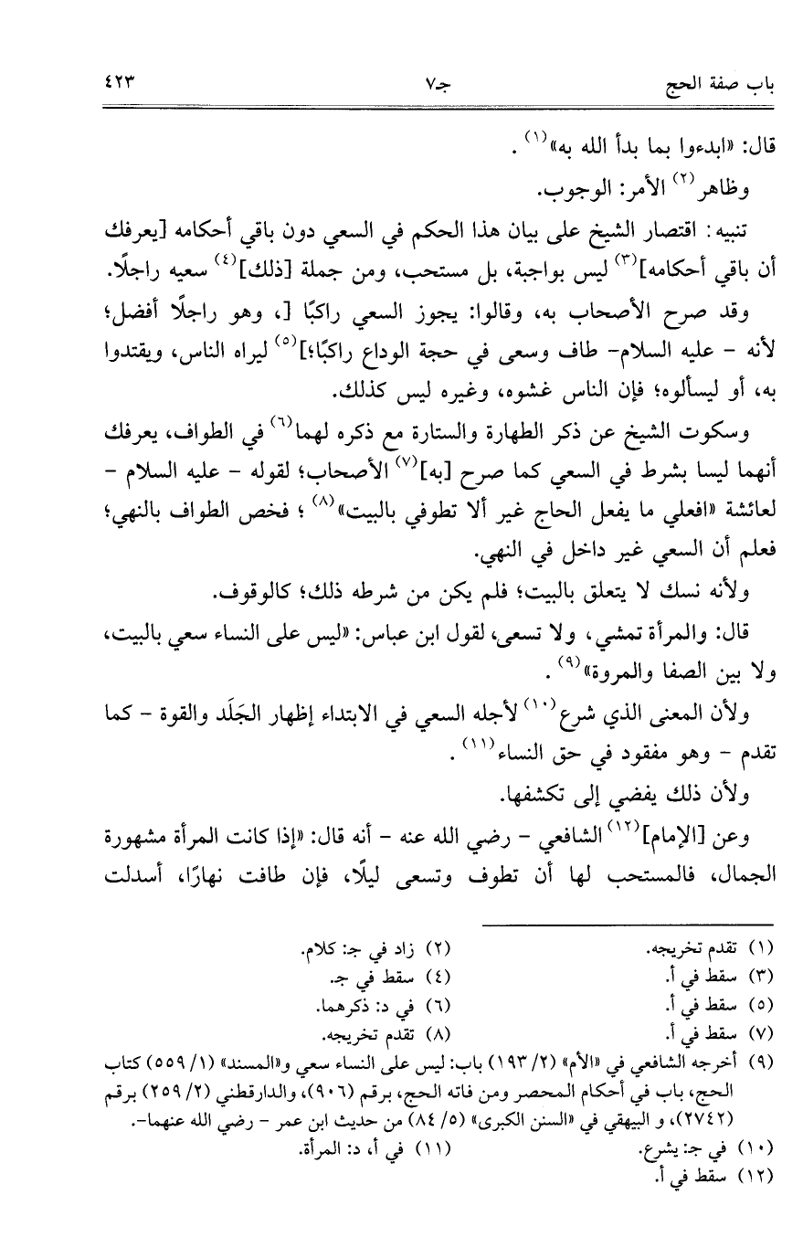 وسكوت الشيخ عن ذكر الطهارة والستارة مع ذكره لهما في الطواف، يعرفك أنهما ليسا بشرط في السعي كما صرح [به] الأصحاب؛ لقوله - عليه السلام - لعائشة "افعلي ما يفعل الحاج غير ألا تطوفي بالبيت"؛ فخص الطواف بالنهي؛ فعلم أن السعي غير داخل في النهي.