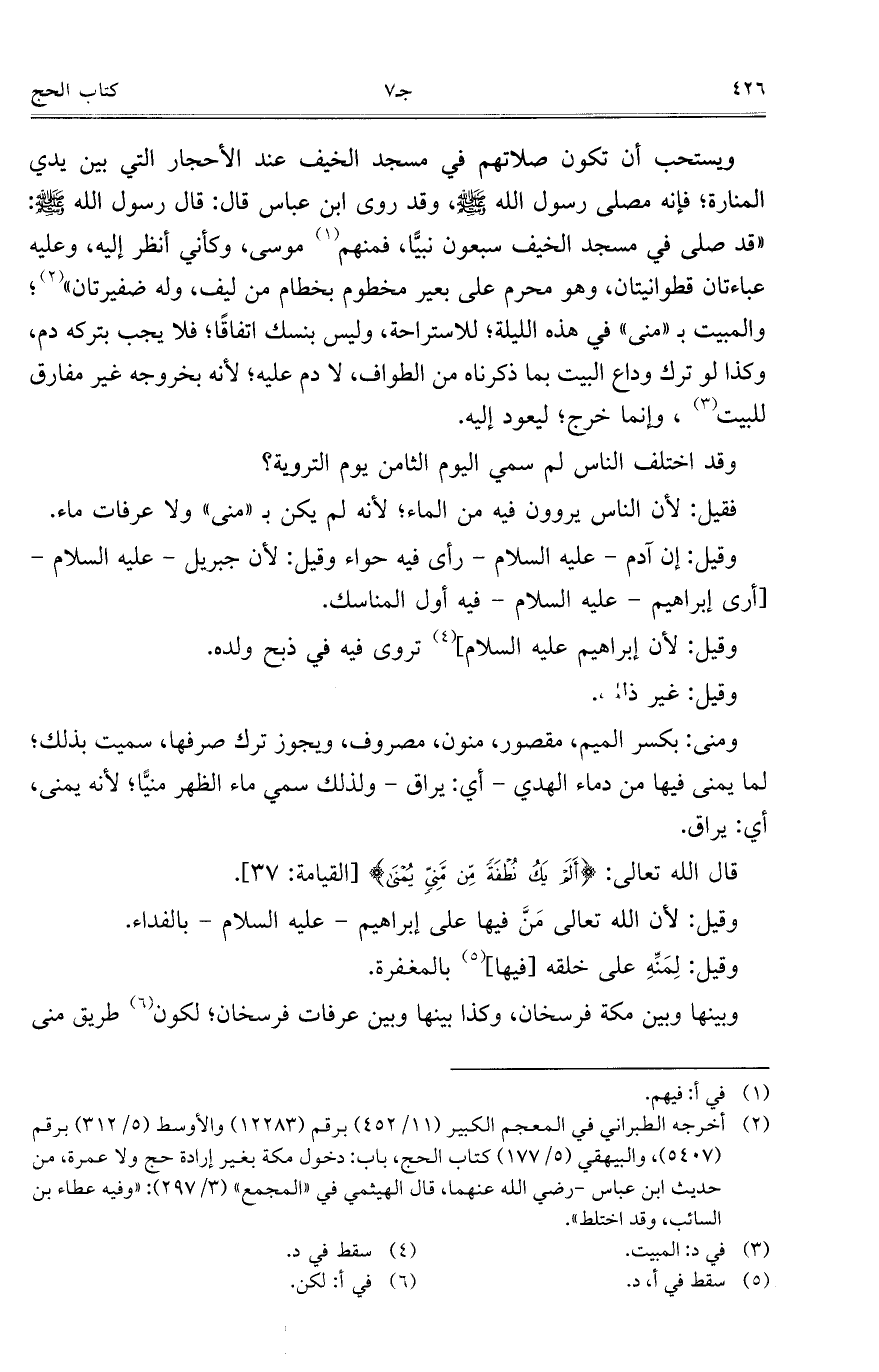 ويستحب أن تكون صلاتهم في مسجد الخيف عند الأحجار التي بين يدي المنارة؛ فإنه مصلى رسول الله صلى الله عليه وسلم، وقد روى ابن عباس قال: قال رسول الله صلى الله عليه وسلم: "قد صلى في مسجد الخيف سبعون نبياً، فمنهم موسى، وكأني أنظر إليه، وعليه عباءتان قطوانيتان، وهو محرم على بعير مخطوم بخطام من ليف، وله ضفيرتان"؛ والمبيت بـ"منى في هذه الليلة؛ للاستراحة، وليس بنسك اتفاقاً؛ فلا يجب بتركه دم، وكذا لو ترك وداع البيت بما ذكرناه من الطواف، لا دم عليه؛ لأنه بخروجه غير مفارق للبيت، وإنما خرج؛ ليعود إليه.