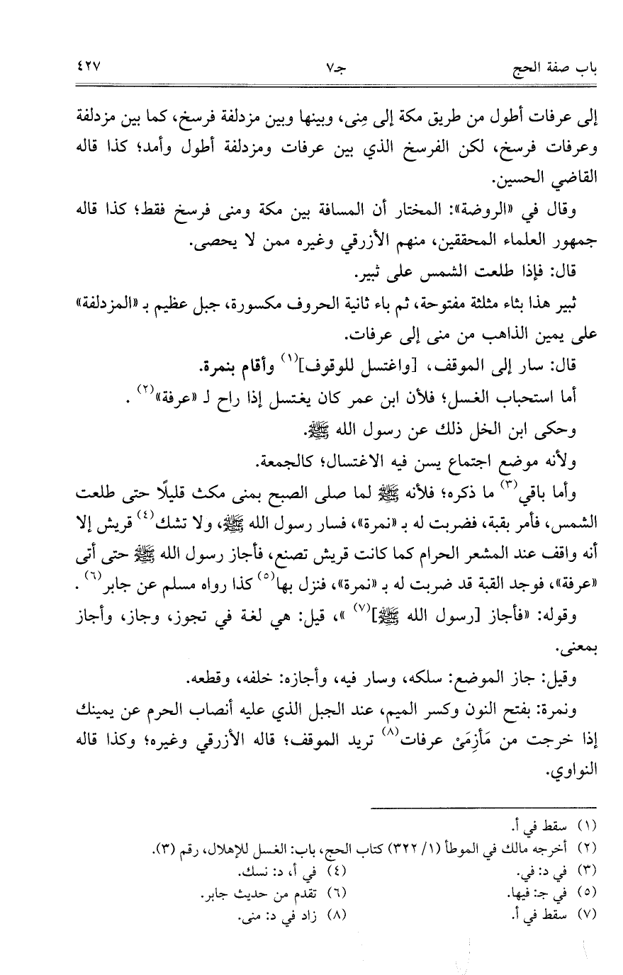 وأما باقي ما ذكره؛ فلأنه صلى الله عليه وسلم لما صلى الصبح بمنى مكث قليلاً حتى طلعت الشمس، فأم بقبة، فضربت له بـ"نمرة"، فسار رسول الله صلى الله عليه وسلم ولا تشك قريش إلا أنه واقف عند المشعر الحرام كما كانت قريش تصنع، فأجاز رسول الله صلى الله عليه وسلم حتى أتى "عرفة"، فوجد القبة قد ضربت له بـ"نمرة"، فنزل بها كذا رواه مسلم عن جابر وقوله: "فأجاز [رسول الله صلى الله عليه وسلم] "، قيل: هي لغة في تجوز، وجاز، وأجاز بمعنى.