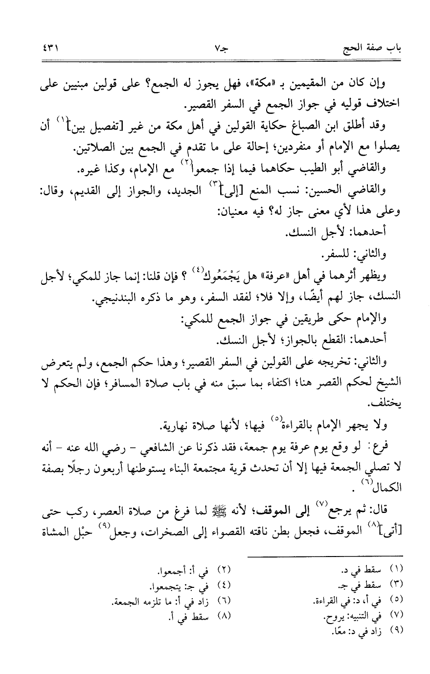 قال: ثم يرجع إلى الموقف؛ لأنه صلى الله عليه وسلم لما فرغ من صلاة العصر، ركب حتى [أتى] الموقف، فجعل بطن ناقته القصواء إلى الصخرات، وجعل حبْل المشاة