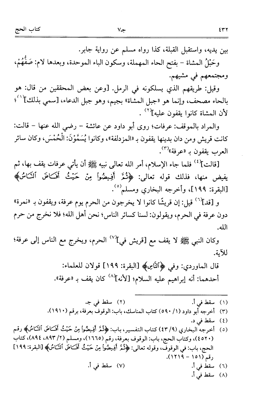 [قالت] فلما جاء الإسلام، أمر الله تعالى نبيه صلى الله عليه وسلم أن يأتي عرفات يقف بها، ثم يفيض منها، فذلك قوله تعالى: {ثُمَّ أَفِيضُوا مِنْ حَيْثُ أَفَاضَ النَّاسُ} [البقرة: 199]، وأخرجه البخاري ومسلم.