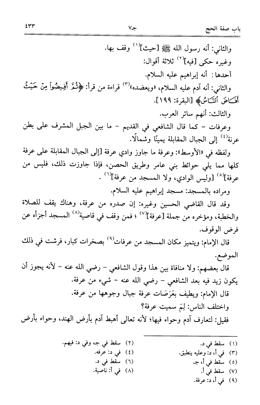 قال بعضهم: ولا منافاة بين هذا وقول الشافعي- رضي الله عنه - لأنه يجوز أن يكون لد فيه بعد الشافعي - رضي الله عنه شيء من عرفة. قال الإمام: ويطيف بعَرَصَات عرفة جبال وجوهها من عرفة.