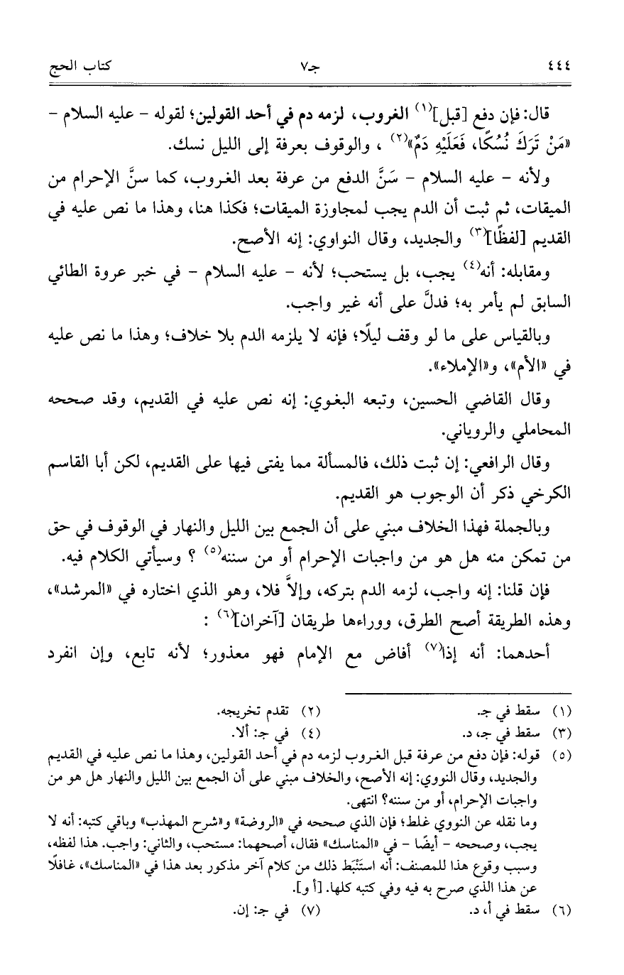 قال: فإن دفع [قبل] الغروب، لزمه دم في أحد القولين؛ لقوله - عليه السلام – "مَنْ تَرَكَ نُسُكًا، فَعَلَيْهِ دَمٌ"، والوقوف بعرفة إلى الليل نسك.