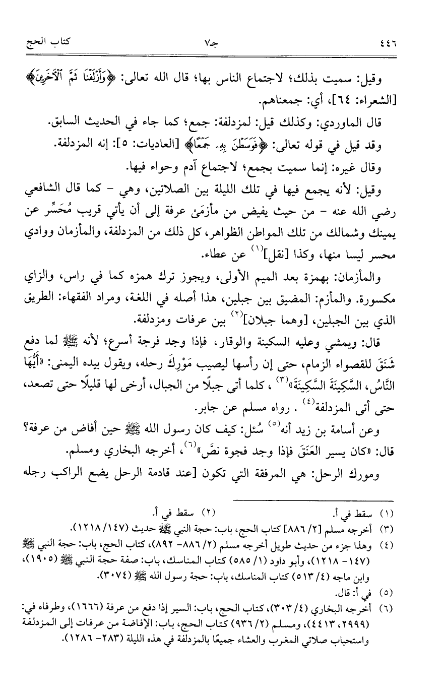 قال: ويمشي وعليه السكينة والوقار، فإذا وجد فرجة أسرع؛ لأنه صلى الله عليه وسلم لما دفع شَنَقَ للقصواء الزمام، حتى إن رأسها ليصيب مَوْرِكَ رحله، ويقول بيده اليمنى: "أَيُّهَا النَّاسُ، السَّكِينَةَ السَّكِينَةَ"، كلما أتى جبلاً من الجبال، أرخى لها قليلاً حتى تصعد، حتى أتى المزدلفة. رواه مسلم عن جابر.