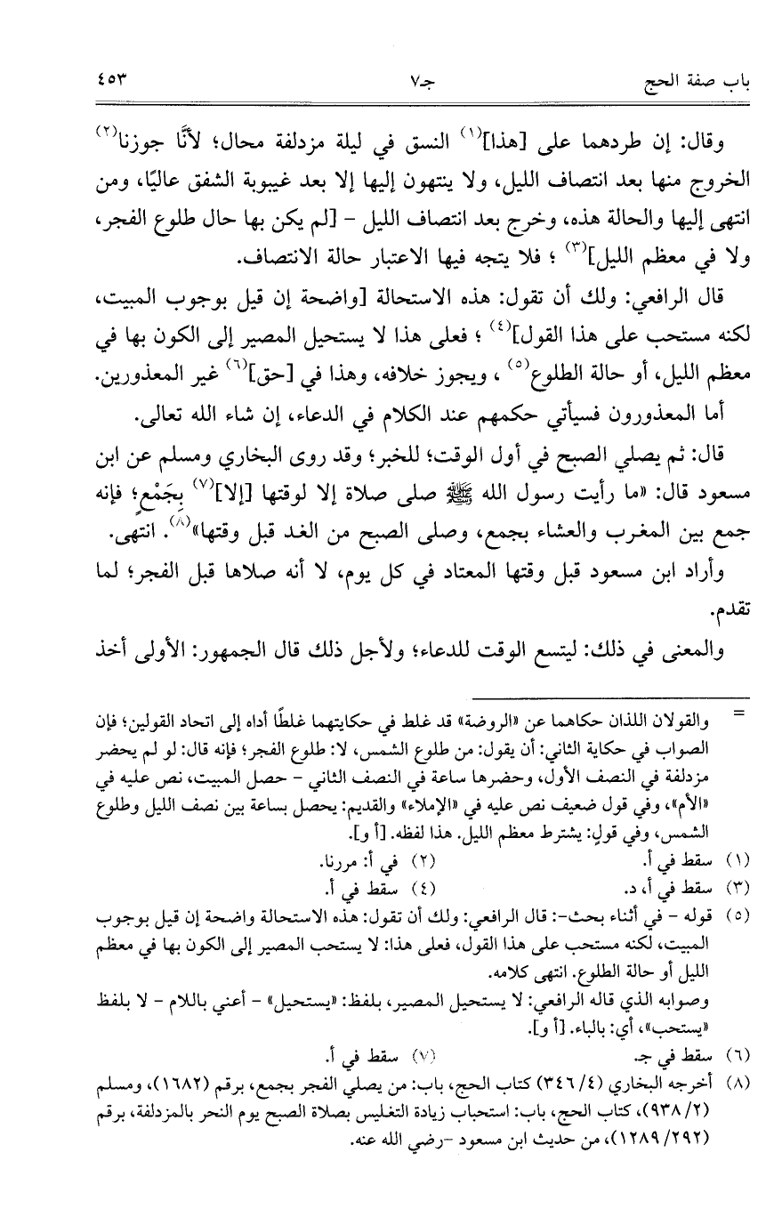 وقال: إن طردهما على [هنا]، النسق في ليلة مزدلفة محال؛ لأنَّا جوزنا الخروج منها بعد انتصاف الليل، ولا ينتهون إليها إلا بعد غيبوبة الشفق عالياً، ومن انتهى إليها والحالة هذه، وخرج بعد انتصاف الليل -[لم يكن بها حال طلوع الفجر، ولا في معظم الليل]؛ فلا يتجه لها الاعتبار حالة الانتصاف.