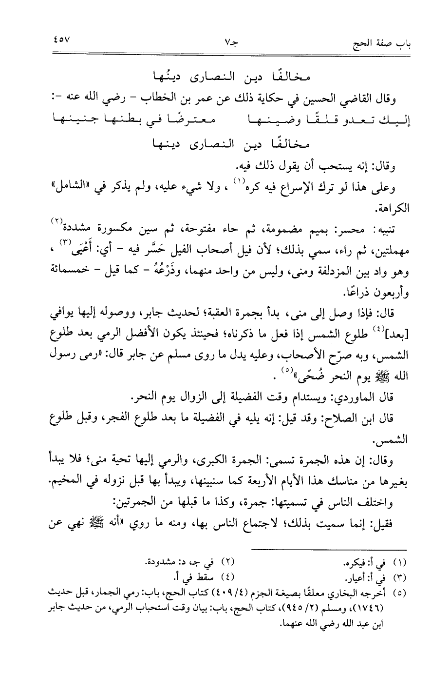 وقال: إن هذه الجمرة تسمى: الجمرة الكبرى، والرمي إليها تحية منى؛ فلا يبدأ بغيرها من مناسك هذا الأيام الأربعة كما سنبينها، ويبدأ بها قبل نزوله في المنعيم.