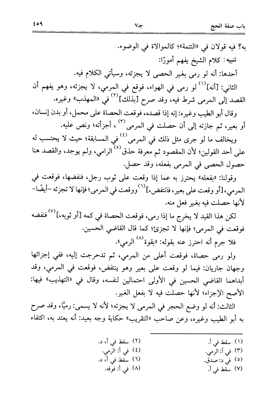 لكن هذا القيد لا يخرج ما إذا رمى، فوقعت الحصاة في كمه [أو ثوبه،] فنفضه فوقعت فى المرمى؛ فإنها لا تجزئ؛ كما قال القاضى الحسين.