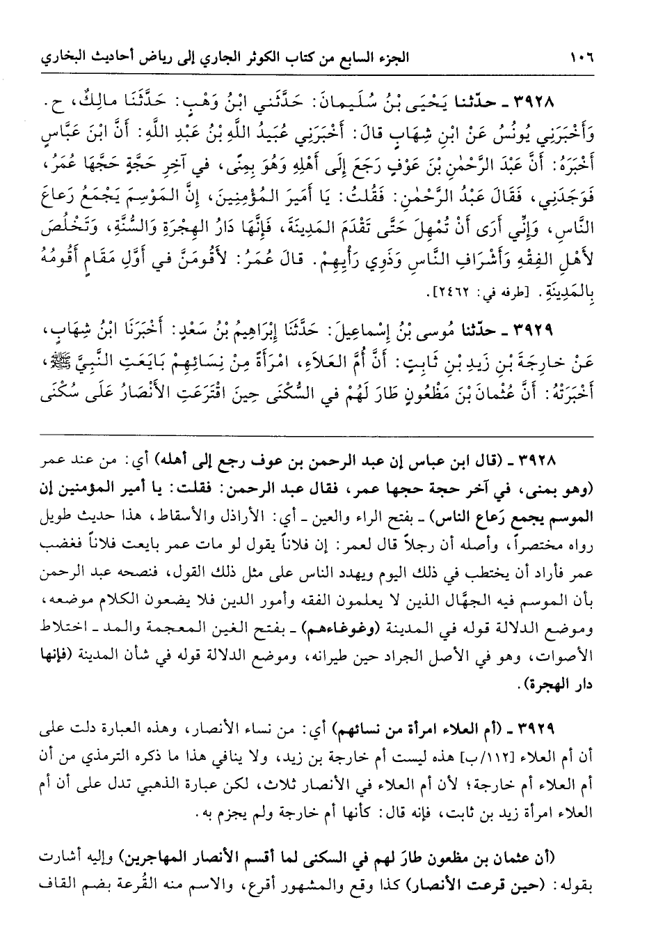 3928 - (قال ابن عباس إن عبد الرحمن بن عوف رجع إلى أهله) أي: من عند عمر (وهو بمنى، في آخر حجة حجها عمر، فقال عبد الرحمن: فقلت: يا أمير المؤمنين إن الموسم يجمع رَعاع الناس) -بفتح الراء والعين- أي: الأراذل والأسقاط، هذا حديث طويل رواه مختصرًا، وأصله أن رجلًا قال لعمر: إن فلانًا يقول لو مات عمر بايعت فلانًا فغضب عمر فأراد أن يختطب في ذلك اليوم ويهدد الناس على مثل ذلك القول، فنصحه عبد الرحمن بأن الموسم فيه الجهَّال الذين لا يعلمون الفقه وأمور الدين فلا يضعون الكلام موضعه، وموضع الدلالة قوله في المدينة (وغوغاءهم) -بفتح الغين المعجمة والمد- اختلاط الأصوات، وهو في الأصل الجراد حين طيرانه، وموضع الدلالة قوله في شأن المدينة (فإنها دار الهجرة).