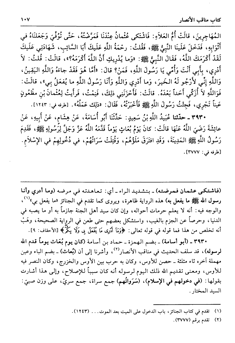 3930 - حَدَّثَنَا عُبَيْدُ اللَّهِ بْنُ سَعِيدٍ حَدَّثَنَا أَبُو أُسَامَةَ عَنْ هِشَامٍ عَنْ أَبِيهِ عَنْ عَائِشَةَ - رضى الله عنها - قَالَتْ كَانَ يَوْمُ بُعَاثٍ يَوْمًا قَدَّمَهُ اللَّهُ عَزَّ وَجَلَّ لِرَسُولِهِ - صلى الله عليه وسلم -، فَقَدِمَ رَسُولُ اللَّهِ - صلى الله عليه وسلم - الْمَدِينَةَ وَقَدِ افْتَرَقَ مَلَؤُهُمْ، وَقُتِلَتْ سَرَاتُهُمْ فِي دُخُولِهِمْ فِي الإِسْلاَمِ. طرفه 3777