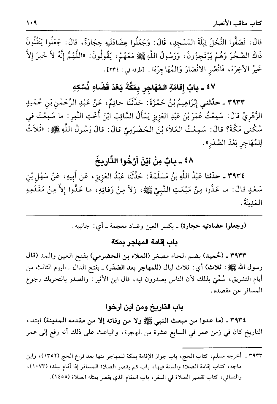 3933 - (حُميد) بضم الحاء مصغر (العلاء بن الحضرمي) بفتح العين والمد (قال رسول الله - صلى الله عليه وسلم -: ثلاث) أي: ثلاث ليال (للمهاجر بعد الصَدَر) -بفتح الدال- اليوم الثالث من أيام التشريق، سُمِّيَ بذلك لأن الناس يصدرون فيه، قال ابن الأثير: والصدر بالتحريك رجوع المسافر عن مقصده.