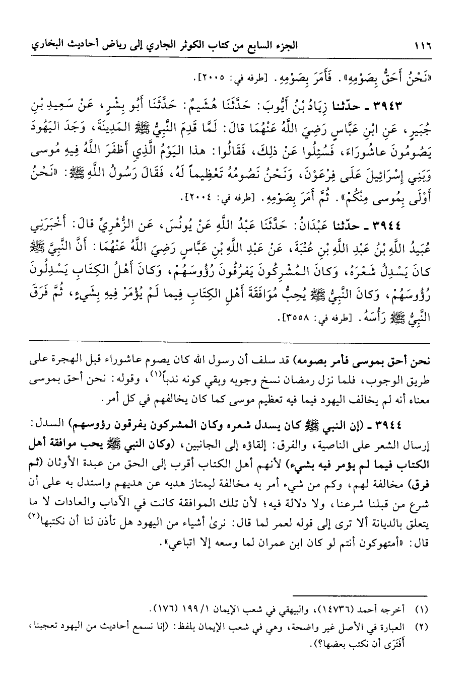 3943 - حَدَّثَنَا زِيَادُ بْنُ أَيُّوبَ حَدَّثَنَا هُشَيْمٌ حَدَّثَنَا أَبُو بِشْرٍ عَنْ سَعِيدِ بْنِ جُبَيْرٍ عَنِ ابْنِ عَبَّاسٍ - رضى الله عنهما - قَالَ لَمَّا قَدِمَ النَّبِىُّ - صلى الله عليه وسلم - الْمَدِينَةَ وَجَدَ الْيَهُودَ يَصُومُونَ عَاشُورَاءَ، فَسُئِلُوا عَنْ ذَلِكَ، فَقَالُوا هَذَا الْيَوْمُ الَّذِى أَظْفَرَ اللَّهُ فِيهِ مُوسَى وَبَنِى إِسْرَائِيلَ عَلَى فِرْعَوْنَ، وَنَحْنُ نَصُومُهُ تَعْظِيمًا لَهُ، فَقَالَ رَسُولُ اللَّهِ - صلى الله عليه وسلم - «نَحْنُ أَوْلَى بِمُوسَى مِنْكُمْ». ثُمَّ أَمَرَ بِصَوْمِهِ. طرفه 2004