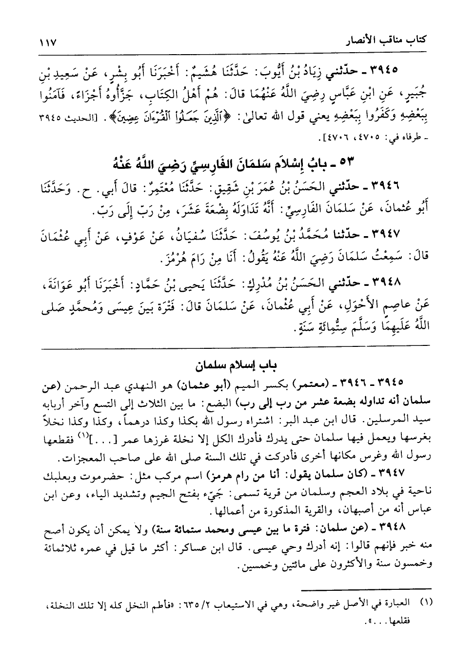 3945 - 3946 - (معتمر) بكسر الميم (أبو عثمان) هو النهدي عبد الرحمن (عن سلمان أنه تداوله بضعة عشر من رب إلى رب) البضع: ما بين الثلاث إلى التسع وآخر أربابه سيد المرسلين. قال ابن عبد البر: اشتراه رسول الله بكذا وكذا درهمًا، وكذا وكذا نخلًا بغرسها ويعمل فيها سلمان حتى يدرك فأدرك الكل إلا نخلة غرزها عمر [...] فقطعها رسول الله وغرس مكانها أخرى فأدركت في تلك السنة صلى الله على صاحب المعجزات.