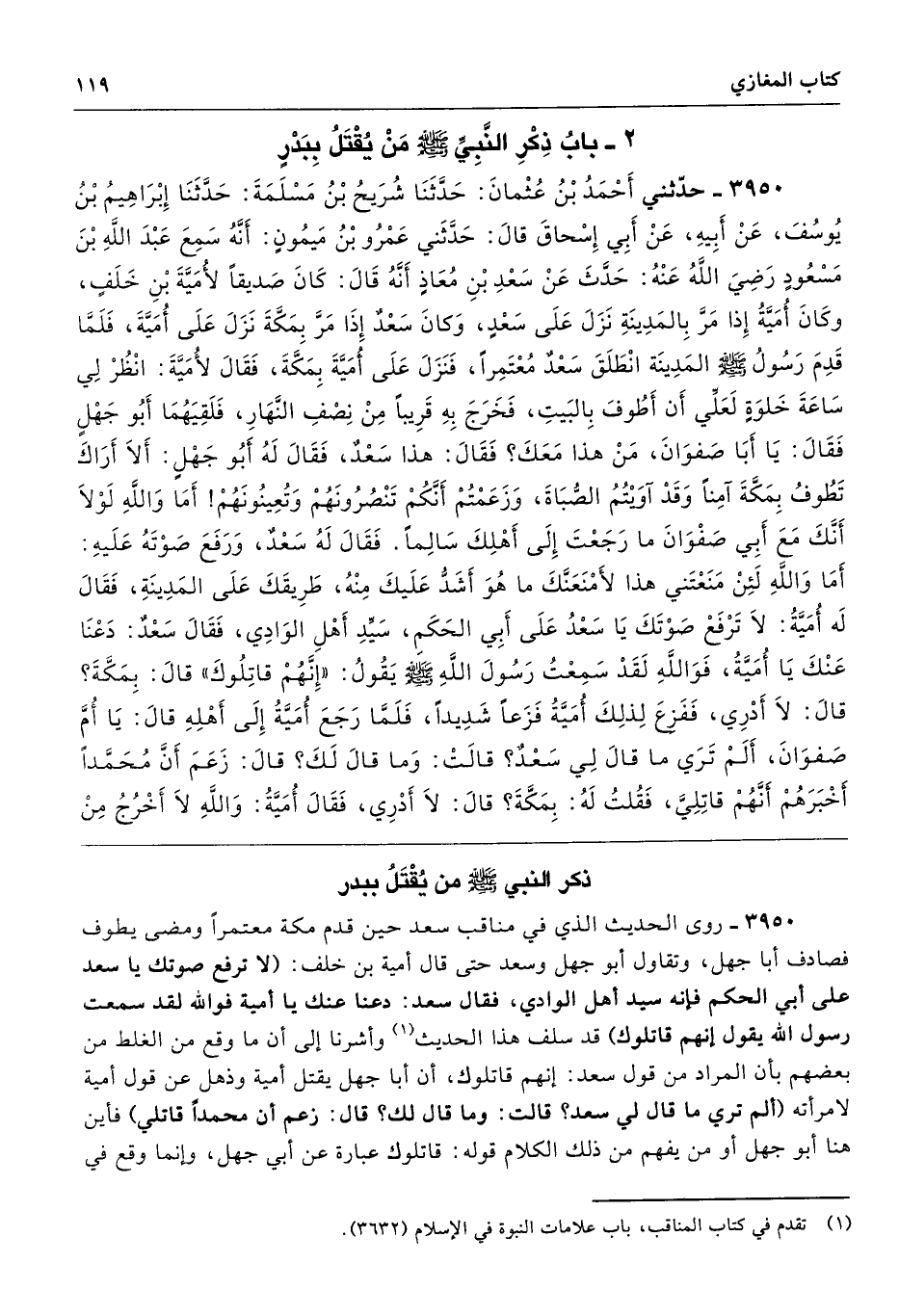 3950 - روى الحديث الذي في مناقب سعد حين قدم مكة معتمرًا ومضى يطوف فصادف أبا جهل، وتقاول أبو جهل وسعد حتى قال أمية بن خلف: (لا ترفع صوتك يا سعد على أبي الحكم فإنه سيد أهل الوادي، فقال سعد: دعنا عنك يا أمية فوالله لقد سمعت رسول الله يقول إنهم قاتلوك) قد سلف هذا الحديث وأشرنا إلى أن ما وقع من الغلط من بعضهم بأن المراد من قول سعد: إنهم قاتلوك، أن أبا جهل يقتل أمية وذهل عن قول أمية لامرأته (ألم تري ما قال لي سعد؟ قالت: وما قال لك؟ قال: زعم أن محمدًا قاتلي) فأين هنا أبو جهل أو من يفهم من ذلك الكلام قوله: قاتلوك عبارة عن أبي جهل، وإنما وقع في