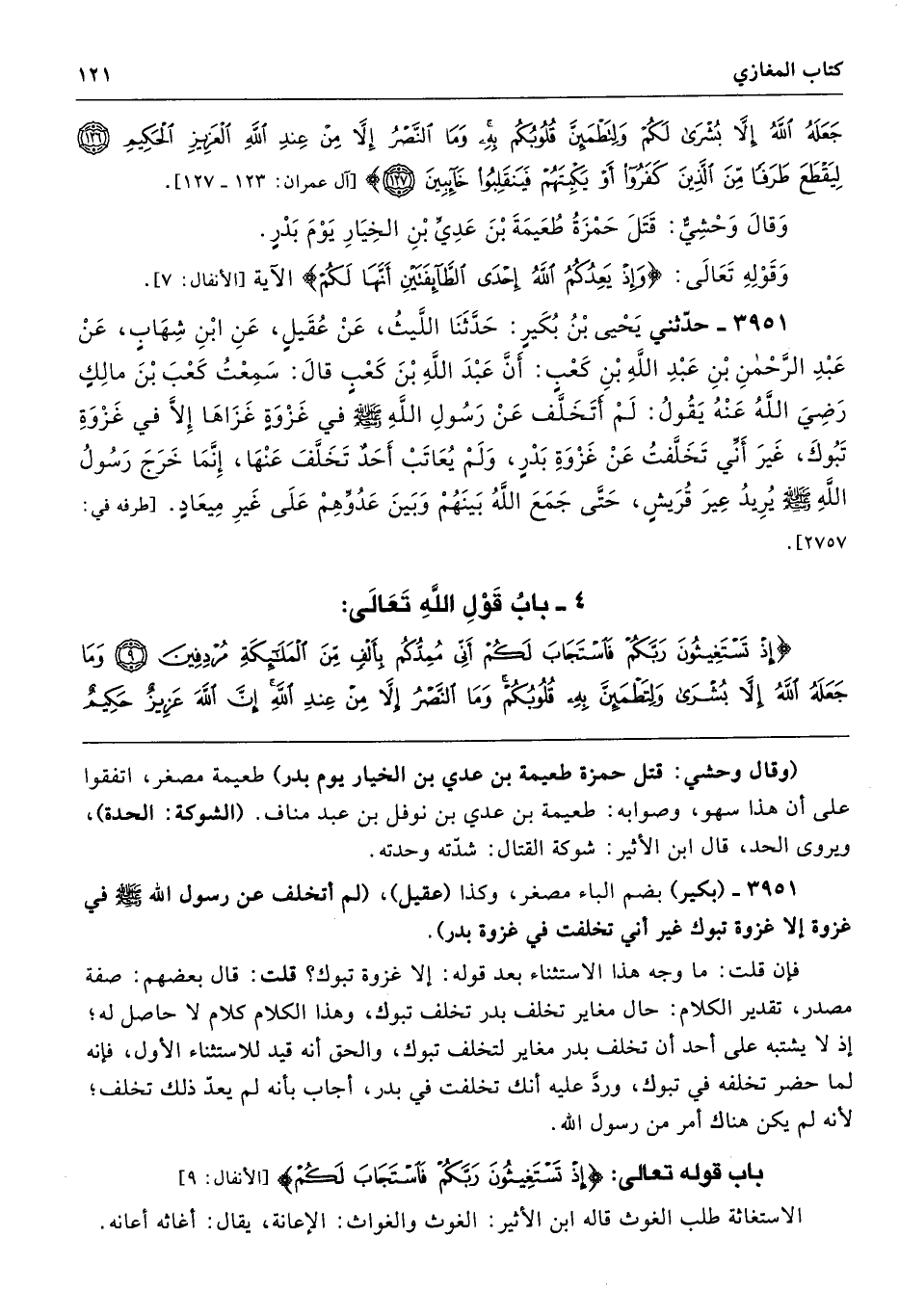 3951 - حَدَّثَنِى يَحْيَى بْنُ بُكَيْرٍ حَدَّثَنَا اللَّيْثُ عَنْ عُقَيْلٍ عَنِ ابْنِ شِهَابٍ عَنْ عَبْدِ الرَّحْمَنِ بْنِ عَبْدِ اللَّهِ بْنِ كَعْبٍ أَنَّ عَبْدَ اللَّهِ بْنَ كَعْبٍ قَالَ سَمِعْتُ كَعْبَ بْنَ مَالِكٍ - رضى الله عنه - يَقُولُ لَمْ أَتَخَلَّفْ عَنْ رَسُولِ اللَّهِ - صلى الله عليه وسلم - فِي غَزْوَةٍ غَزَاهَا إِلاَّ فِي غَزْوَةِ تَبُوكَ، غَيْرَ أَنِّى تَخَلَّفْتُ عَنْ غَزْوَةِ بَدْرٍ، وَلَمْ يُعَاتَبْ أَحَدٌ تَخَلَّفَ عَنْهَا، إِنَّمَا خَرَجَ رَسُولُ اللَّهِ - صلى الله عليه وسلم - يُرِيدُ عِيرَ قُرَيْشٍ، حَتَّى جَمَعَ اللَّهُ بَيْنَهُمْ وَبَيْنَ عَدُوِّهِمْ عَلَى غَيْرِ مِيعَادٍ. طرفه 2757