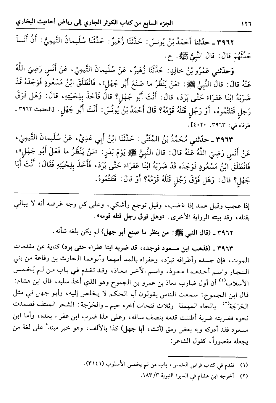 3962 - حَدَّثَنَا أَحْمَدُ بْنُ يُونُسَ حَدَّثَنَا زُهَيْرٌ حَدَّثَنَا سُلَيْمَانُ التَّيْمِىُّ أَنَّ أَنَسًا حَدَّثَهُمْ قَالَ قَالَ النَّبِىُّ - صلى الله عليه وسلم - ح وَحَدَّثَنِى عَمْرُو بْنُ خَالِدٍ حَدَّثَنَا زُهَيْرٌ عَنْ سُلَيْمَانَ التَّيْمِىِّ عَنْ أَنَسٍ - رضى الله عنه - قَالَ قَالَ النَّبِىُّ - صلى الله عليه وسلم - «مَنْ يَنْظُرُ مَا صَنَعَ أَبُو جَهْلٍ» فَانْطَلَقَ ابْنُ مَسْعُودٍ، فَوَجَدَهُ قَدْ ضَرَبَهُ ابْنَا عَفْرَاءَ حَتَّى بَرَدَ قَالَ آأَنْتَ أَبُو جَهْلٍ قَالَ فَأَخَذَ بِلِحْيَتِهِ. قَالَ وَهَلْ فَوْقَ رَجُلٍ قَتَلْتُمُوهُ أَوْ رَجُلٍ قَتَلَهُ قَوْمُهُ قَالَ أَحْمَدُ بْنُ يُونُسَ أَنْتَ أَبُو جَهْلٍ. طرفاه 3963، 4020
