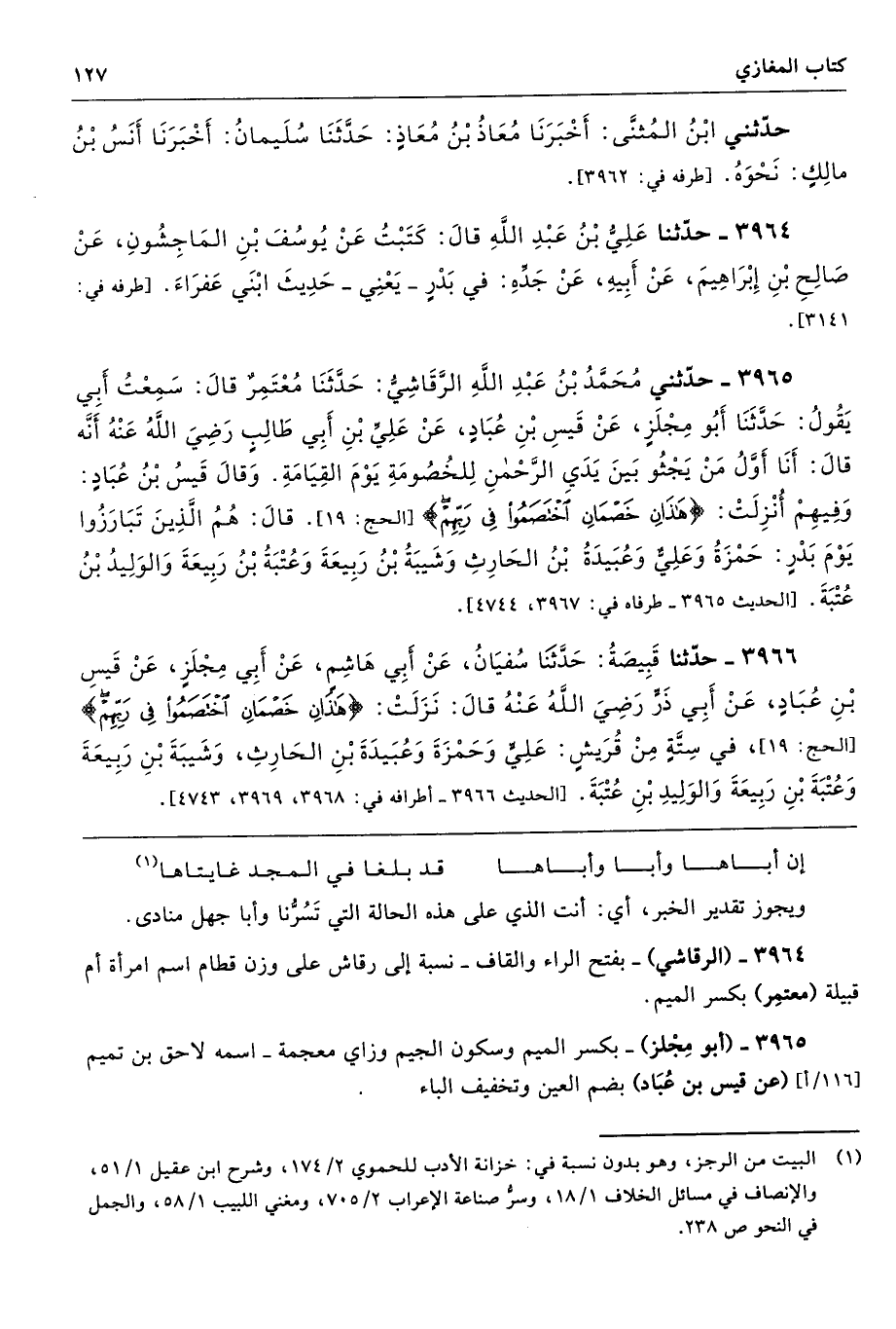 3965 - حَدَّثَنِى مُحَمَّدُ بْنُ عَبْدِ اللَّهِ الرَّقَاشِىُّ حَدَّثَنَا مُعْتَمِرٌ قَالَ سَمِعْتُ أَبِى يَقُولُ حَدَّثَنَا أَبُو مِجْلَزٍ عَنْ قَيْسِ بْنِ عُبَادٍ عَنْ عَلِىِّ بْنِ أَبِى طَالِبٍ - رضى الله عنه - أَنَّهُ قَالَ أَنَا أَوَّلُ مَنْ يَجْثُو بَيْنَ يَدَىِ الرَّحْمَنِ لِلْخُصُومَةِ يَوْمَ الْقِيَامَةِ. وَقَالَ قَيْسُ بْنُ عُبَادٍ وَفِيهِمْ أُنْزِلَتْ (هَذَانِ خَصْمَانِ اخْتَصَمُوا فِي رَبِّهِمْ) قَالَ هُمُ الَّذِينَ تَبَارَزُوا يَوْمَ بَدْرٍ حَمْزَةُ وَعَلِىٌّ وَعُبَيْدَةُ أَوْ أَبُو عُبَيْدَةَ بْنُ الْحَارِثِ وَشَيْبَةُ بْنُ رَبِيعَةَ وَعُتْبَةُ وَالْوَلِيدُ بْنُ عُتْبَةَ. طرفاه 3967، 4744