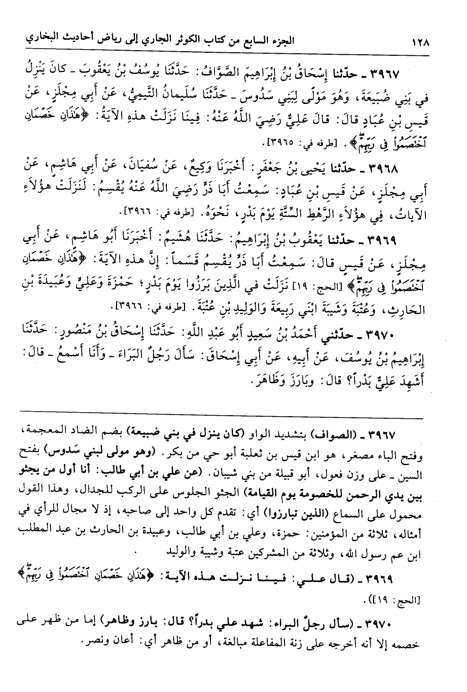 3967 - (الصواف) بتشديد الواو كان ينزل في بني ضبيعة) بضم الضاد المعجمة، وفتح الباء مصغر، هو ابن قيس بن ثعلبة أبو حي من بكر. (وهو مولى لبني سَدوس) -بفتح السين- على وزن فعول، أبو قبيلة من بني شيبان. (عن علي بن أبي طالب: أنا أول من يجثو بين يدي الرحمن للخصومة يوم القيامة) الجثو الجلوس على الركب للجدال، وهذا القول محمول على السماع (الذين تبارزوا) أي: تقدم كل واحد إلى صاحبه، إذ لا مجال للرأي في أمثاله، ثلاثة من المؤمنين: حمزة، وعلي بن أبي طالب، وعبيدة بن الحارث بن عبد المطلب ابن عم رسول الله، وثلاثة من المشركين عتبة وشيبة والوليد.