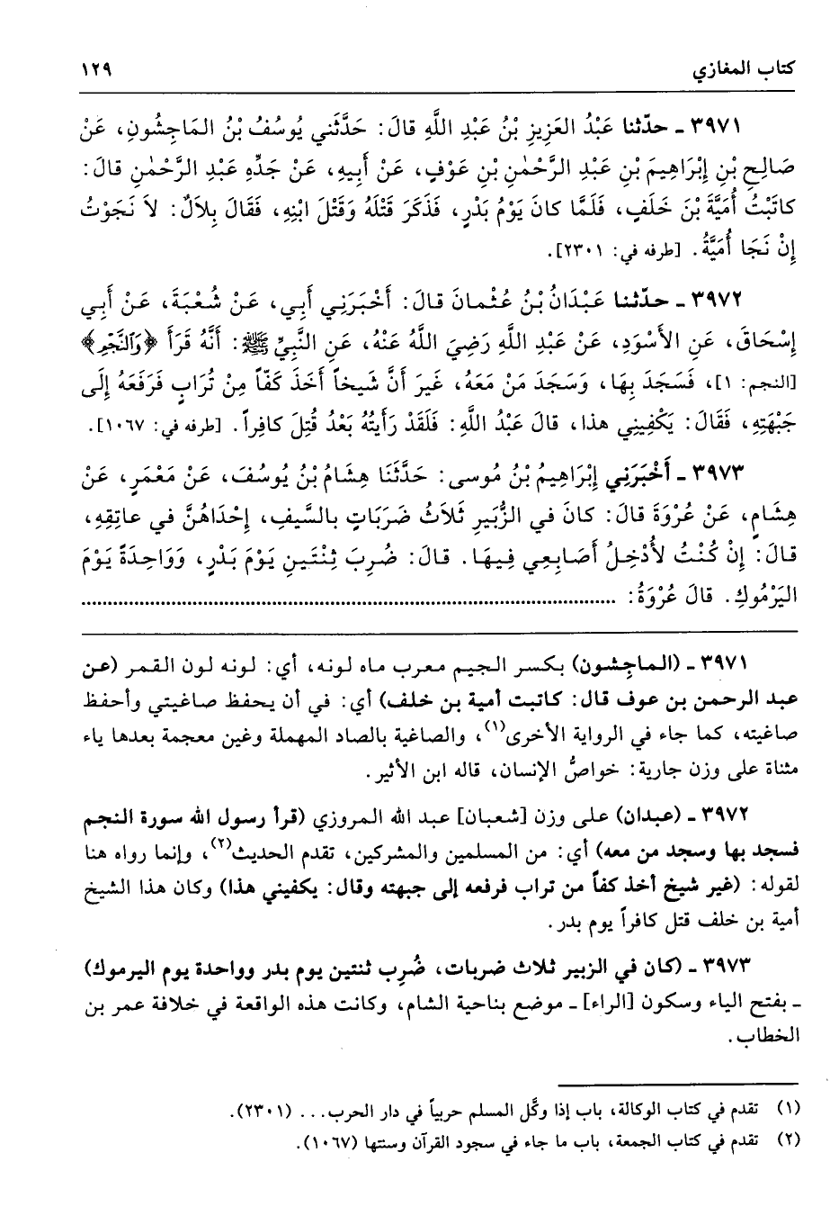 3972 - (عبدان) على وزن [شعبان] عبد الله المروزي (قرأ رسول الله سورة النجم فسجد بها وسجد من معه) أي: من المسلمين والمشركين، تقدم الحديث، وإنما رواه هنا لقوله: (غير شيخ أخذ كفًّا من تراب فرفعه إلى جبهته وقال: يكفيني هذا) وكان هذا الشيخ أمية بن خلف قتل كافرًا يوم بدر.
