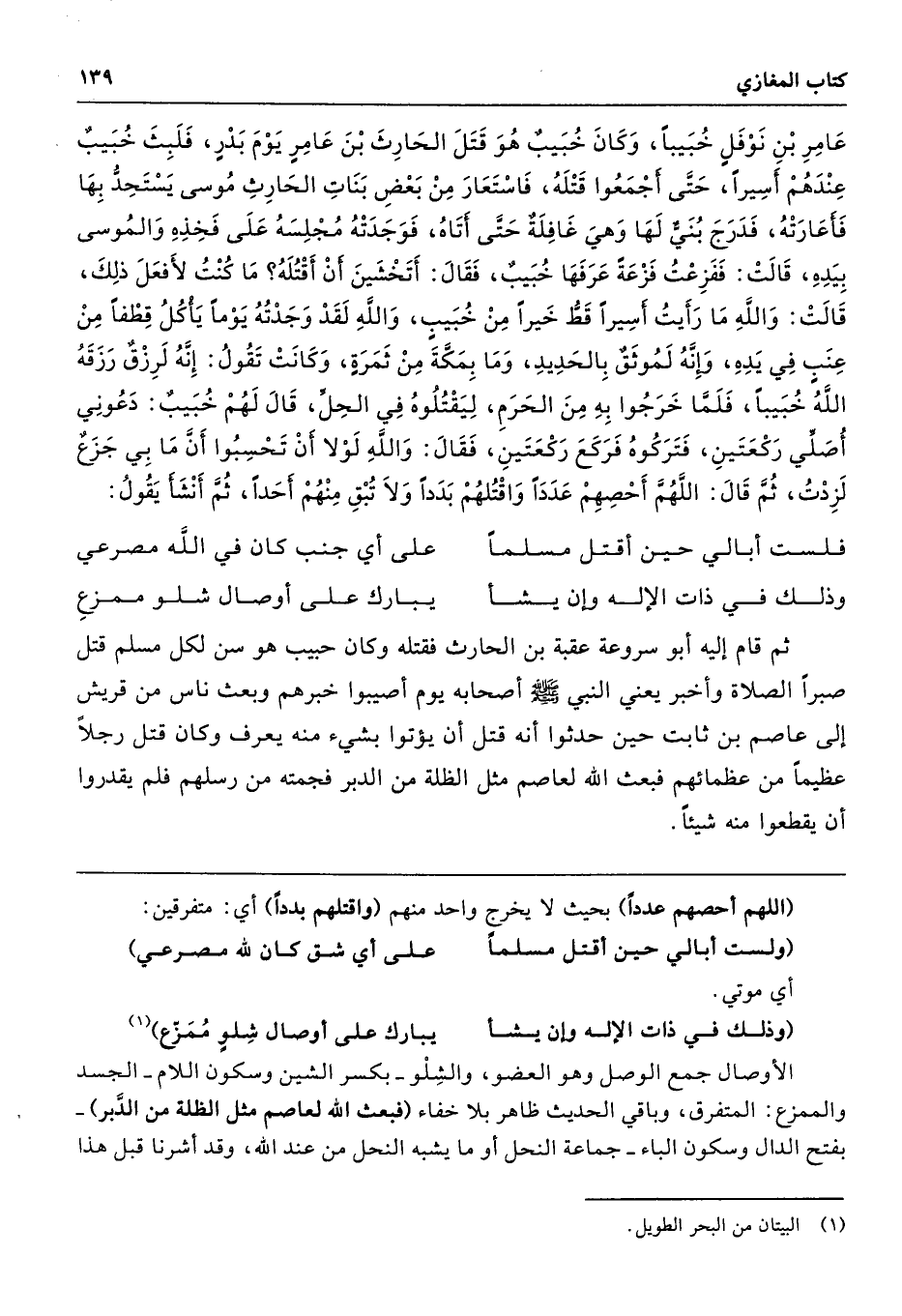عَامِرِ بْنِ نَوْفَلٍ خُبَيْبًا، وَكَانَ خُبَيْبٌ هُوَ قَتَلَ الْحَارِثَ بْنَ عَامِرٍ يَوْمَ بَدْرٍ، فَلَبِثَ خُبَيْبٌ عِنْدَهُمْ أَسِيرًا حَتَّى أَجْمَعُوا قَتْلَهُ، فَاسْتَعَارَ مِنْ بَعْضِ بَنَاتِ الْحَارِثِ مُوسَى يَسْتَحِدُّ بِهَا فَأَعَارَتْهُ، فَدَرَجَ بُنَىٌّ لَهَا وَهْىَ غَافِلَةٌ حَتَّى أَتَاهُ، فَوَجَدَتْهُ مُجْلِسَهُ عَلَى فَخِذِهِ وَالْمُوسَى بِيَدِهِ قَالَتْ فَفَزِعْتُ فَزْعَةً عَرَفَهَا خُبَيْبٌ فَقَالَ أَتَخْشَيْنَ أَنْ أَقْتُلَهُ مَا كُنْتُ لأَفْعَلَ ذَلِكَ قَالَتْ وَاللَّهِ مَا رَأَيْتُ أَسِيرًا قَطُّ خَيْرًا مِنْ خُبَيْبٍ، وَاللَّهِ لَقَدْ وَجَدْتُهُ يَوْمًا يَأْكُلُ قِطْفًا مِنْ عِنَبٍ فِي يَدِهِ، وَإِنَّهُ لَمُوثَقٌ بِالْحَدِيدِ، وَمَا بِمَكَّةَ مِنْ ثَمَرَةٍ وَكَانَتْ تَقُولُ إِنَّهُ لَرِزْقٌ رَزَقَهُ اللَّهُ خُبَيْبًا، فَلَمَّا خَرَجُوا بِهِ مِنَ الْحَرَمِ لِيَقْتُلُوهُ فِي الْحِلِّ قَالَ لَهُمْ خُبَيْبٌ دَعُونِى أُصَلِّى رَكْعَتَيْنِ. فَتَرَكُوهُ فَرَكَعَ رَكْعَتَيْنِ، فَقَالَ وَاللَّهِ لَوْلاَ أَنْ تَحْسِبُوا أَنَّ مَا بِى جَزَعٌ لَزِدْتُ، ثُمَّ قَالَ اللَّهُمَّ أَحْصِهِمْ عَدَدًا، وَاقْتُلْهُمْ بَدَدًا، وَلاَ تُبْقِ مِنْهُمْ أَحَدًا. ثُمَّ أَنْشَأَ يَقُولُ: