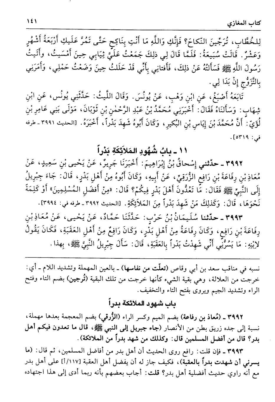 3992 - (مُعاذ بن رفاعة) بضم الميم وكسر الراء (الزُّرقي) بضم المعجمة بعدها مهملة، نسبة إلى جده زريق بطن من الأنصار (جاء جبريل إلى النبي - صلى الله عليه وسلم -، قال ما تعدون فيكم أهل بدر؟ قال من أفضل المسلمين قال: وكذلك من شهد بدرًا من الملائكة).