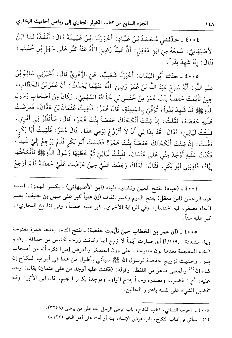 4005 - (أن عمر بن الخطاب حين تأيَّمت حفصة) -بفتح التاء، بعدها همزة مفتوحة وياء مشددة- أي صارت أيّمًا لا زوج لها وكانت زوجة خُنيس بن حذافة -بضم الخاء المعجمة بعدها نون مفتوحة- على وزن المصغر والغرض [من] ذكره أنه من أصحاب بدر. وحديث تزويج حفصة لرسول الله - صلى الله عليه وسلم - سيأتي بأطول من هذا في أبواب النكاح إن شاء الله والمعنى ظاهر من اللفظ. وقوله: (فكنت عليه أوجد من على عثمان) يقال: وجد عليه، أي: غضب، ومصدره وجدًا بفتح الواو، وموجِدة بكسر الجيم، قال ابن الأثير: وفيه تفضيل الشيء على نفسه باعتبار الحالين.