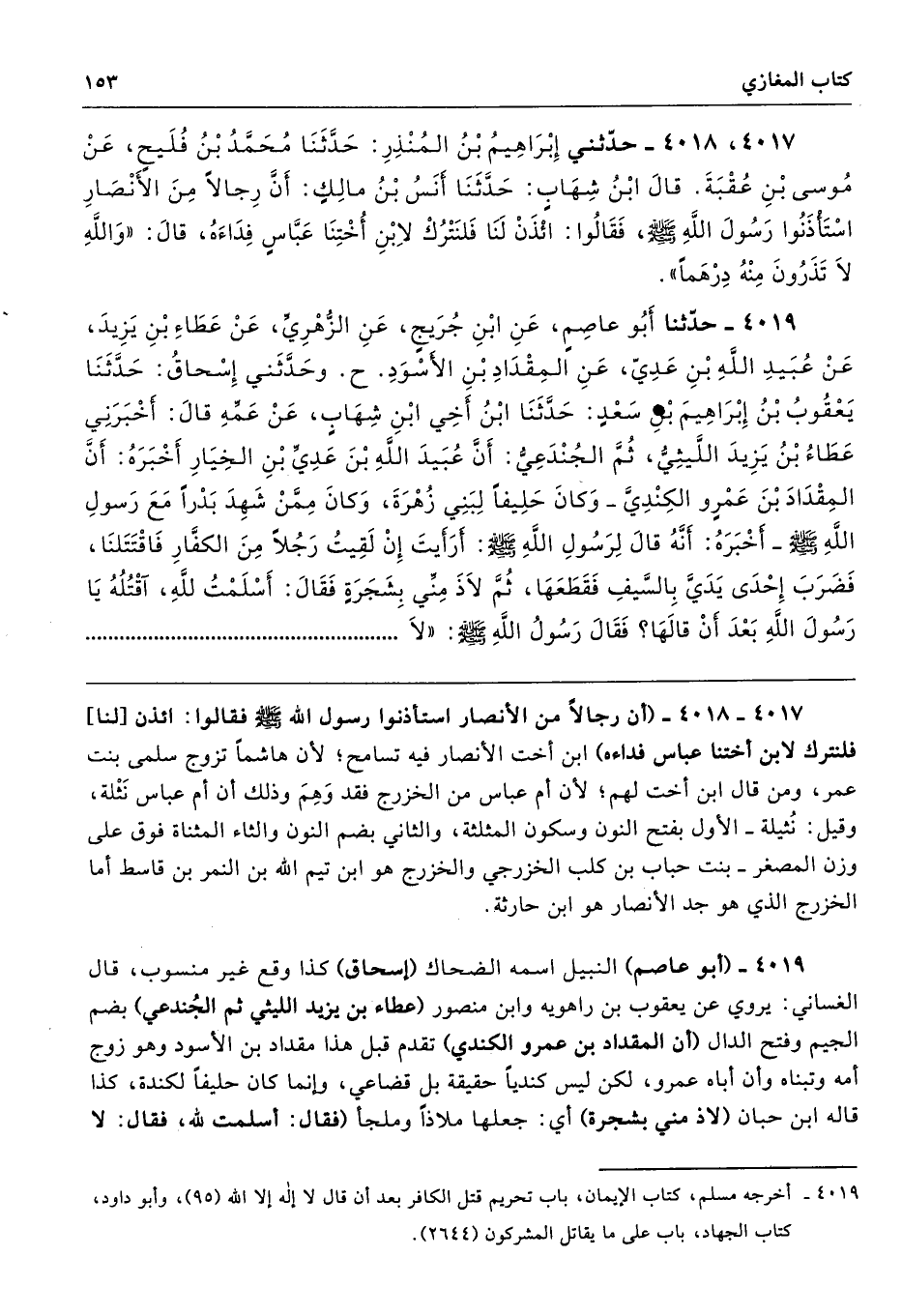 4017 - 4018 - (أن رجالًا من الأنصار استأذنوا رسول الله - صلى الله عليه وسلم - فقالوا: ائذن [لنا] فلنترك لابن أختنا عباس فداءه) ابن أخت الأنصار فيه تسامح؛ لأن هاشمًا تزوج سلمى بنت عمر، ومن قال ابن أخت لهم؛ لأن أم عباس من الخزرج فقد وَهِمَ وذلك أن أم عباس نَثْلة، وقيل: نُثيلة -الأول بفتح النون وسكون المثلثة، والثاني بضم النون والثاء المثناة فوق على وزن المصغر- بنت حباب بن كلب الخزرجي والخزرج هو ابن تيم الله بن النمر بن قاسط أما الخزرج الَّذي هو جد الأنصار هو ابن حارثة.