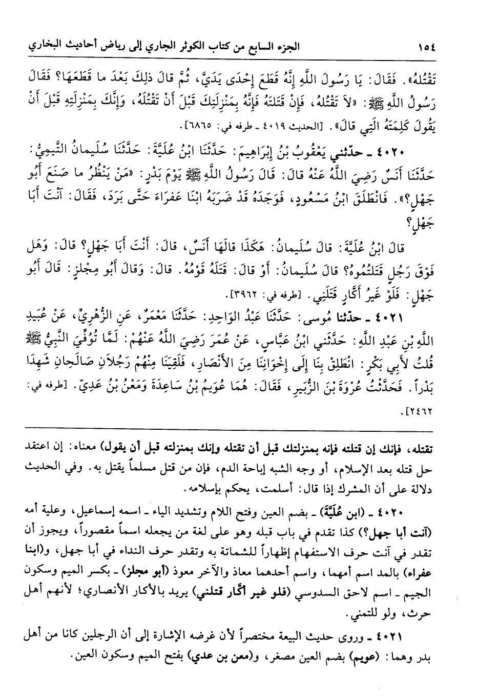 4020 - (أبن عُلَيَّةَ) -بضم العين وفتح اللام وتشديد الياء- اسمه إسماعيل، وعلية أمه (آنت أبا جهل؟) كذا تقدم في باب قبله وهو على لغة من يجعله اسمًا مقصورًا، ويجوز أن تقدر في آنت حرف الاستفهام إظهارًا للشماتة به وتقدر حرف النداء في أبا جهل، و (ابنا عفراء) بالمد اسم أمهما، واسم أحدهما معاذ والآخر معوذ (أبو مجلز) -بكسر الميم وسكون الجيم- اسم لاحق السدوسي (فلو غير أكَّار قتلتي) يريد بالأكار الأنصاري؛ لأنهم أهل حرث، ولو للتمني.