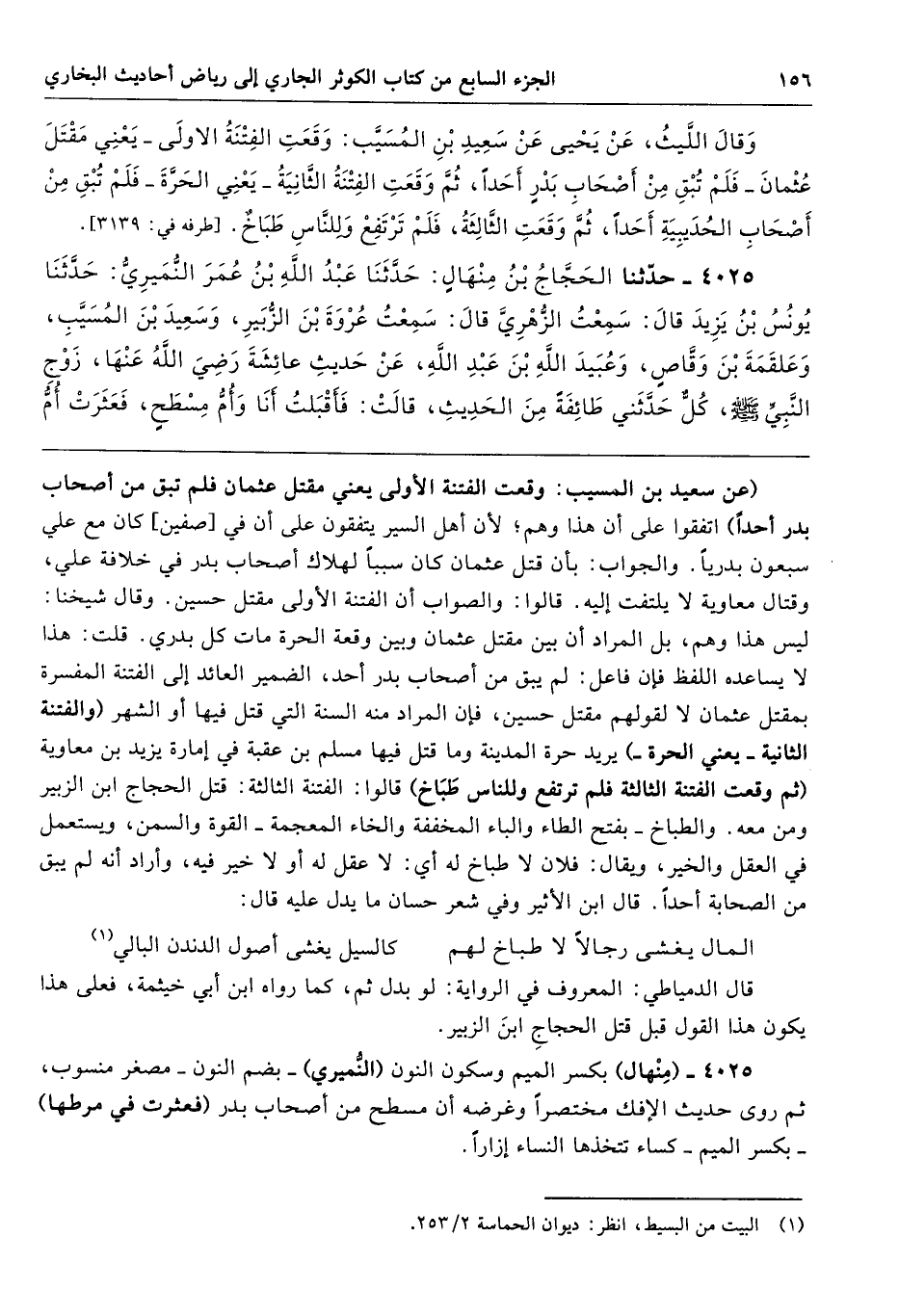 (عن سعيد بن المسيب: وقعت الفتنة الأولى يعني مقتل عثمان فلم تبق من أصحاب بدر أحدًا) اتفقوا على أن هذا وهم؛ لأن أهل السير يتفقون على أن في [صفين] كان مع علي سبعون بدريًّا. والجواب: بأن قتل عثمان كان سببًا لهلاك أصحاب بدر في خلافة علي، وقتال معاوية لا يلتفت إليه. قالوا: والصواب أن الفتنة الأولى مقتل حسين. وقال شيخنا: ليس هذا وهم، بل المراد أن بين مقتل عثمان وبين وقعة الحرة مات كل بدري. قلت: هذا لا يساعده اللفظ فإن فاعل: لم يبق من أصحاب بدر أحد، الضمير العائد إلى الفتنة المفسرة بمقتل عثمان لا لقولهم مقتل حسين، فإن المراد منه السنة التي قتل فيها أو الشهر (والفتنة الثانية -يعني الحرة-) يريد حرة المدينة وما قتل فيها مسلم بن عقبة في إمارة يزيد بن معاوية (ثم وقعت الفتنة الثالثة فلم ترتفع وللناس طَبَاخ) قالوا: الفتنة الثالثة: قتل الحجاج ابن الزبير ومن معه. والطباخ -بفتح الطاء والباء المخففة والخاء المعجمة- القوة والسمن، ويستعمل في العقل والخير، ويقال: فلان لا طباخ له أي: لا عقل له أو لا خير فيه، وأراد أنَّه لم يبق من الصحابة أحدًا. قال ابن الأثير وفي شعر حسان ما يدل عليه قال: